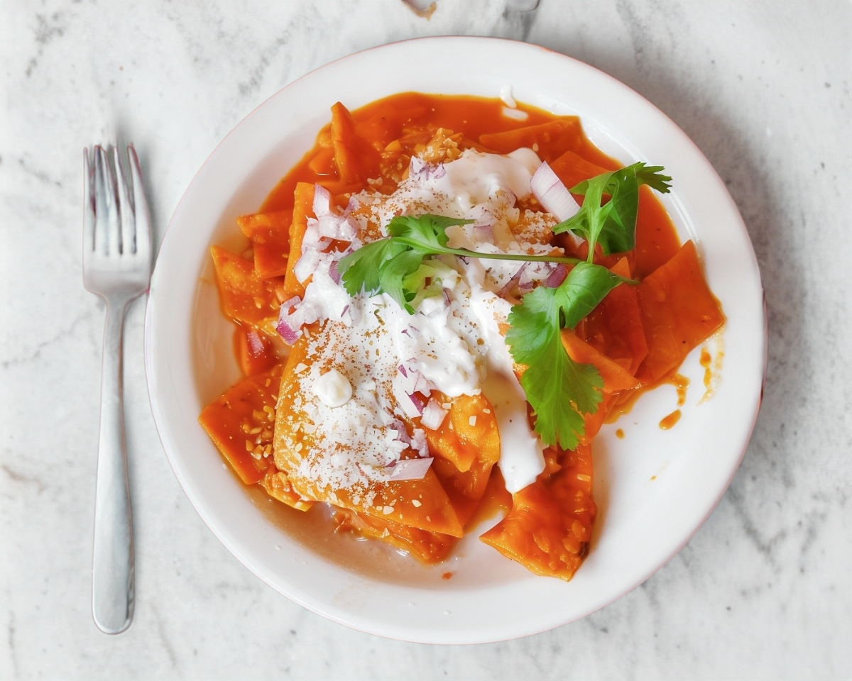Chilaquiles en salsa roja, con crema, queso cotija, bolillo, frijoles y ensalada de lechuga.