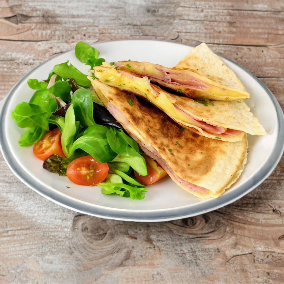 Tortilla de harina con jamón, queso blanco, queso amarillo y lechuga.