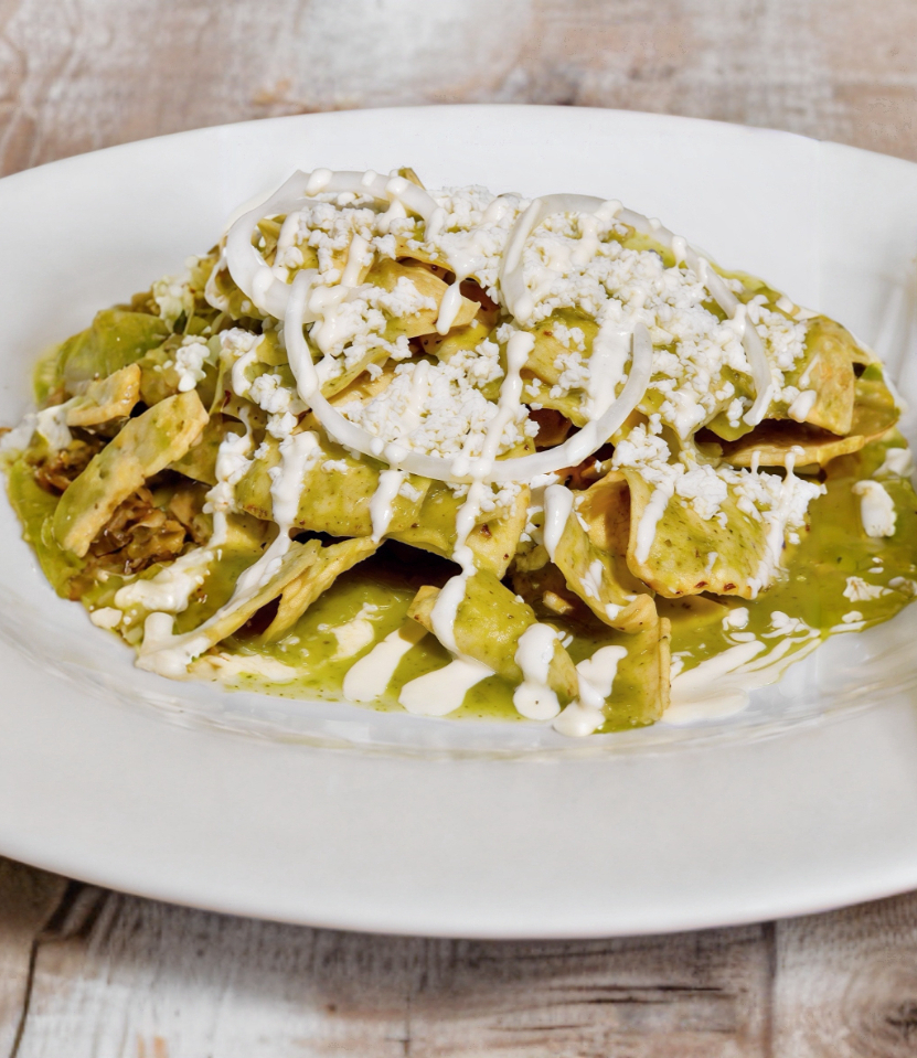 Chilaquiles en salsa verde, con crema, queso cotija, bolillo, frijoles y ensalada de lechuga.