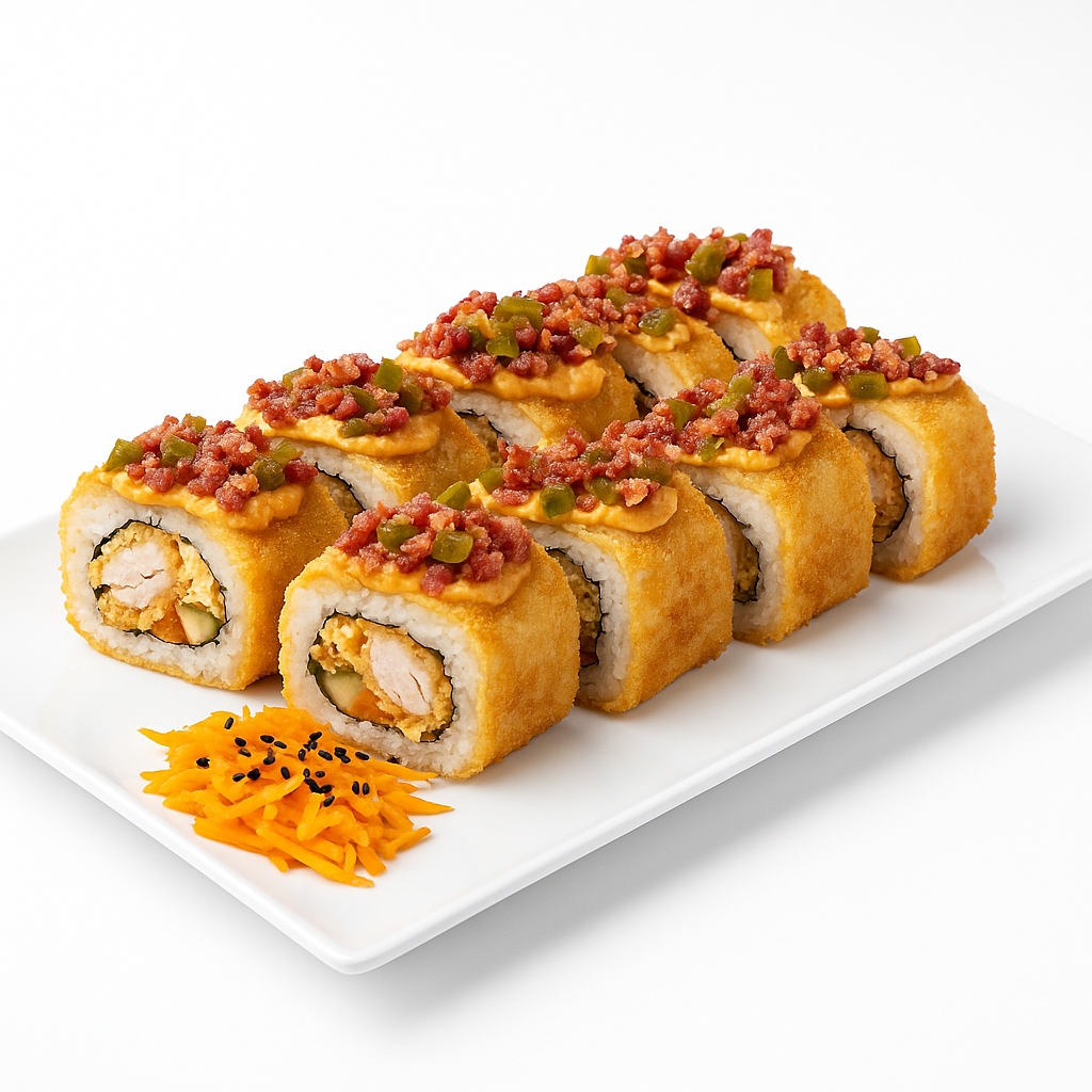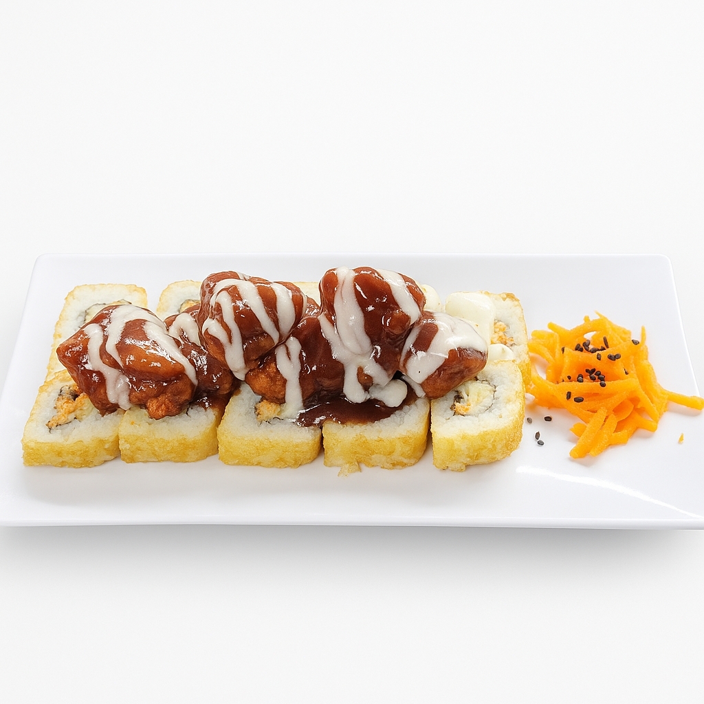 Rollo con pollo empanizado, relleno de pepino, zanahoria y philadelphia, con topping de tocino, jalapeño y aderezo chipotle. Incluye salsa de soya.