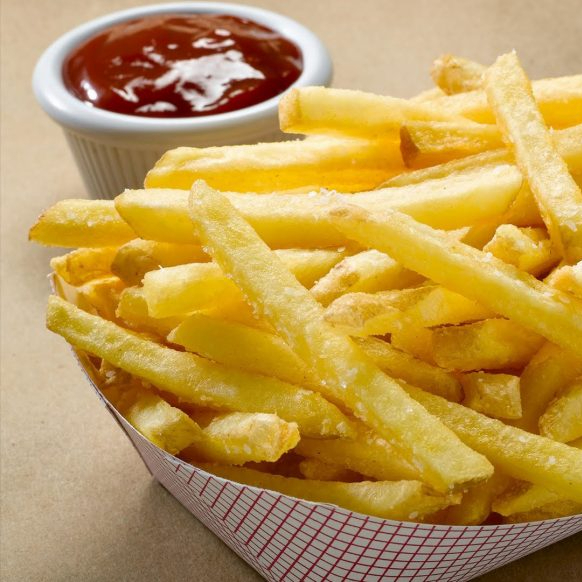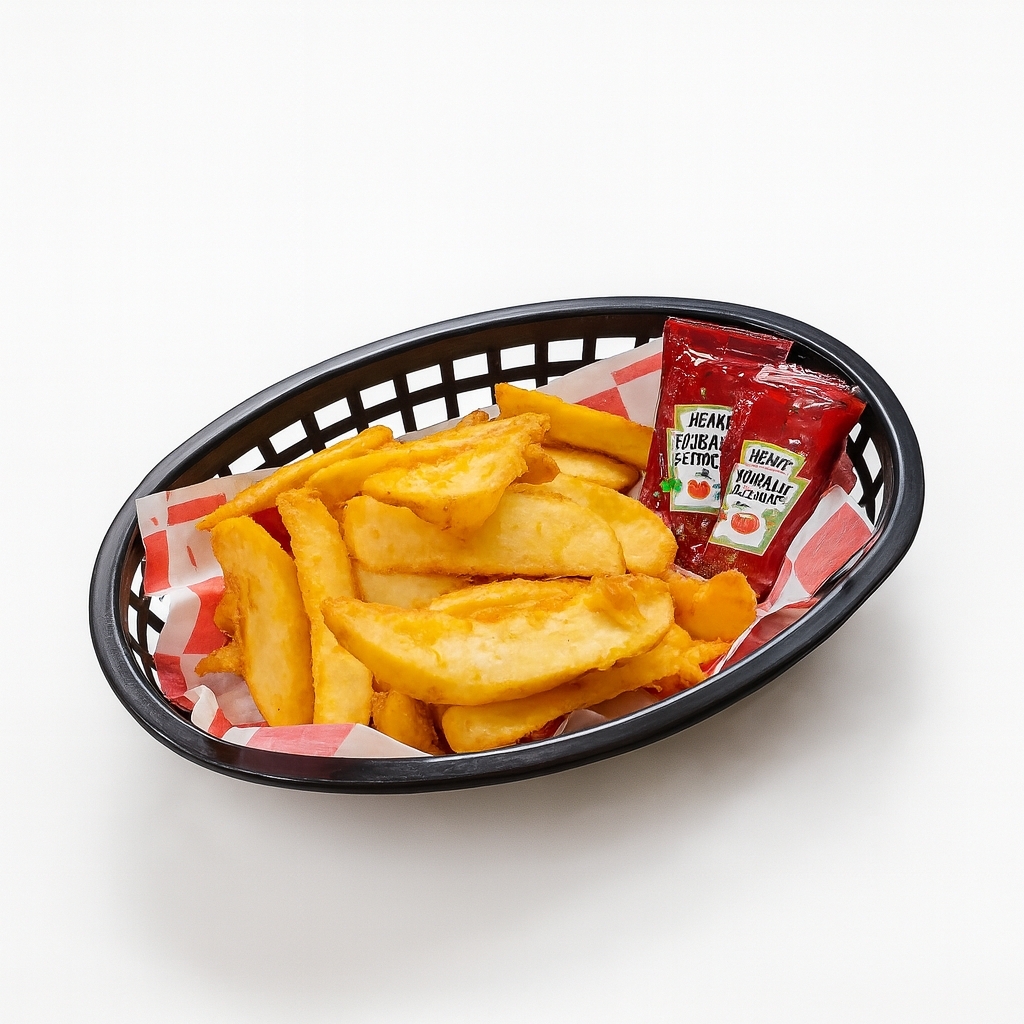 Porción de 250 g de papas a la francesa, acompañadas de una salsa a elegir y kétchup.