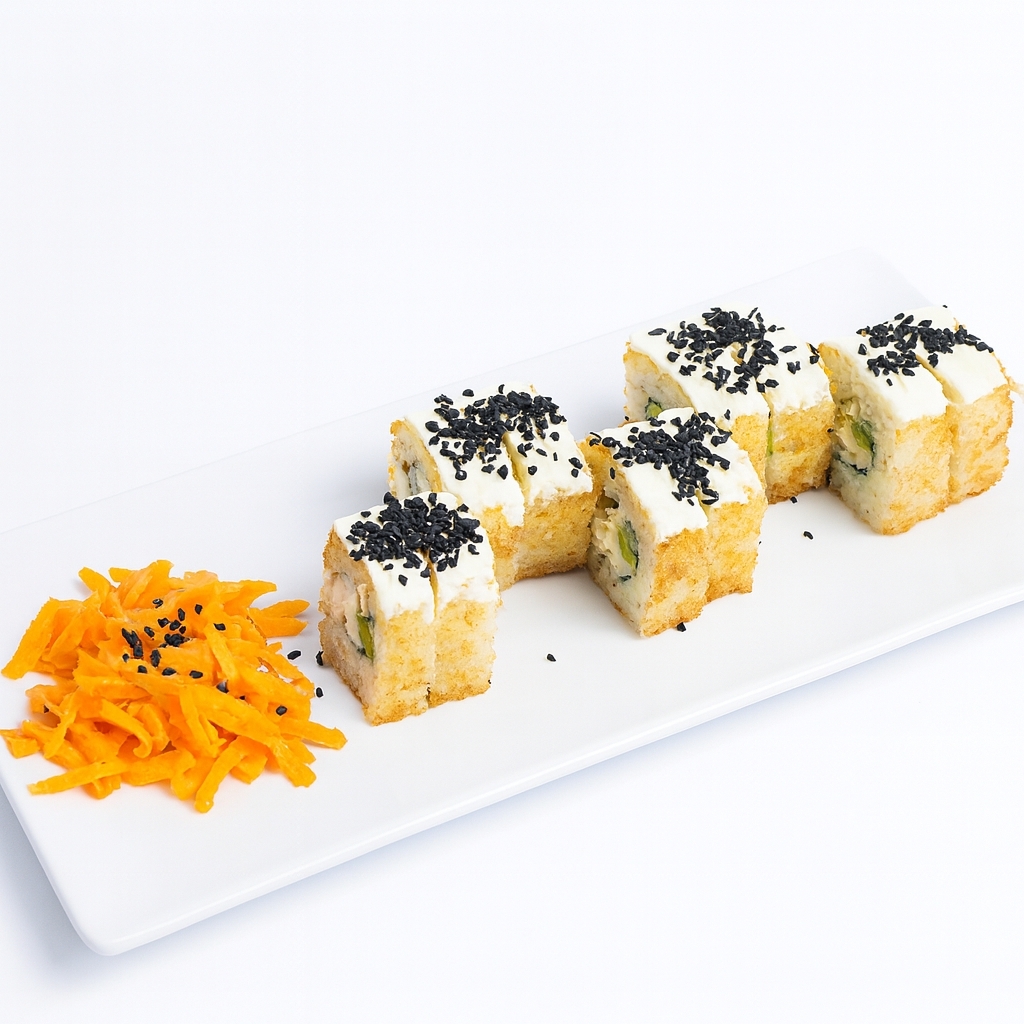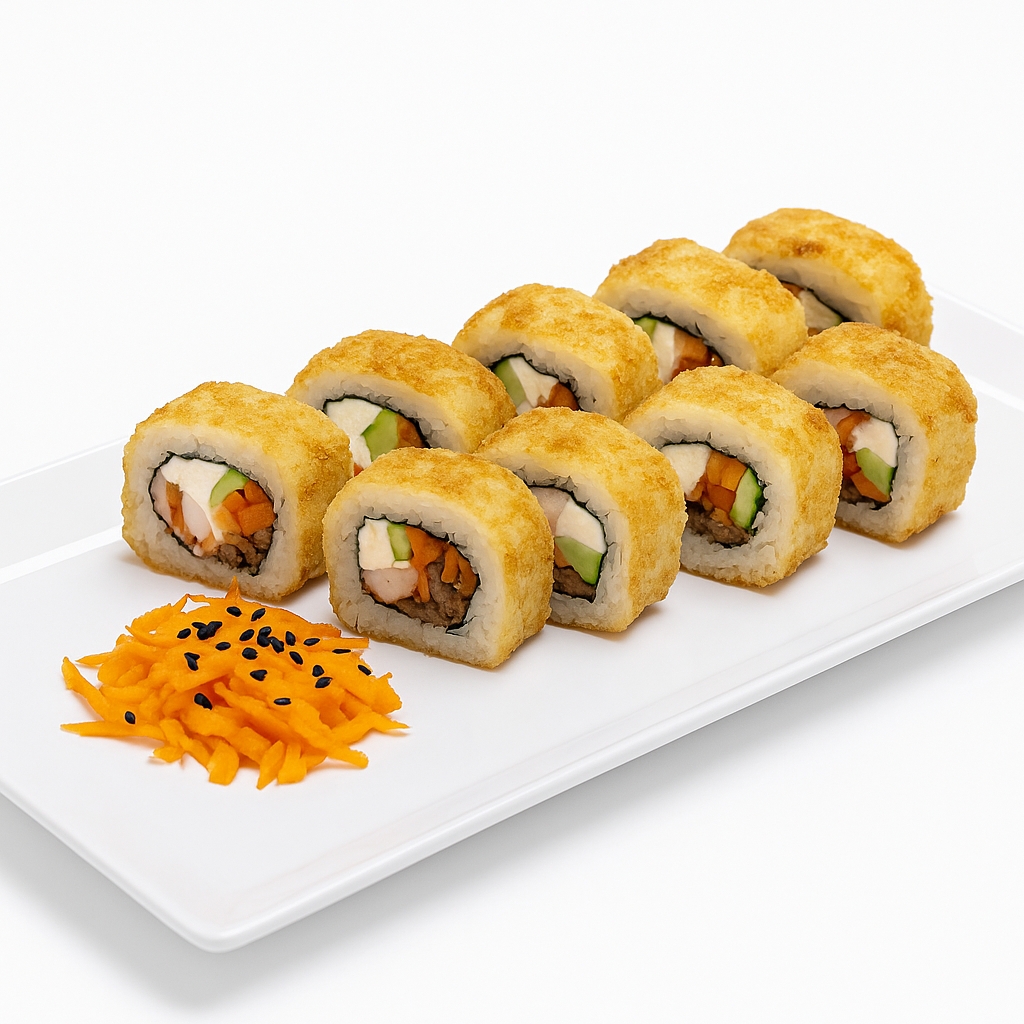 Rollo con pollo empanizado, pepino, zanahoria y philadelphia, cubierto con ajonjolí. Incluye salsa de soya.
