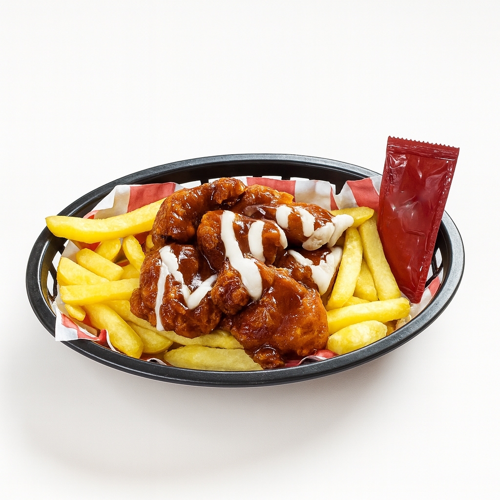 Combinación de 150 g de boneless y 100 g de papas a la francesa, bañados en una salsa a elegir y acompañados de aderezo ranch.