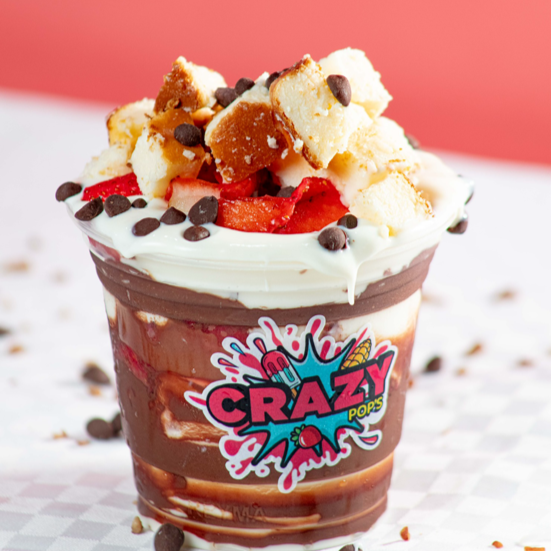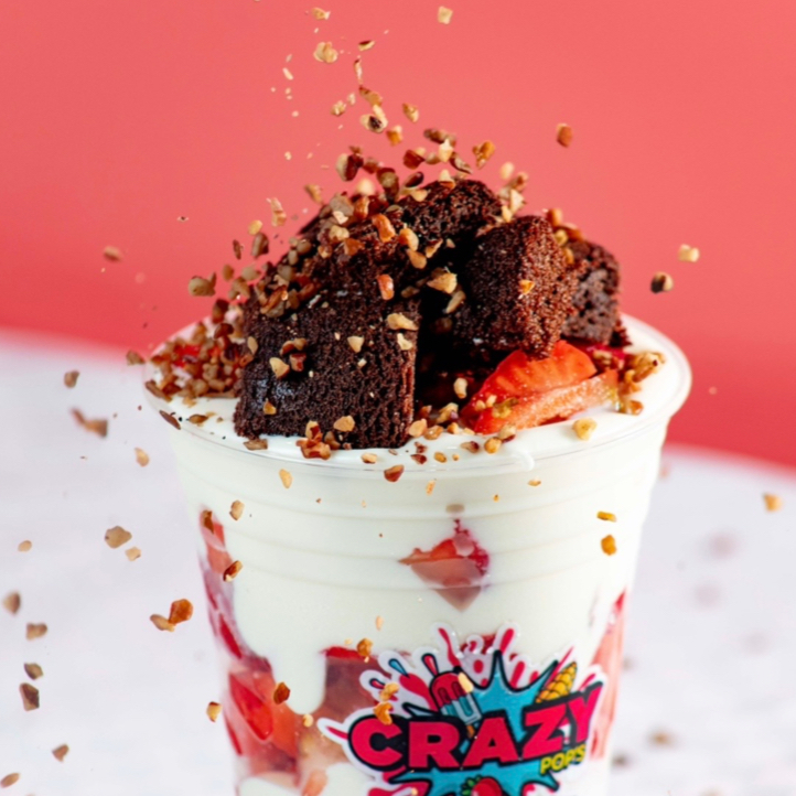 FRESA NATURAL CON CREMA DULCE PREPARACION ESPECIAL DE LA CASA Y TROZOS DE BROWNIE