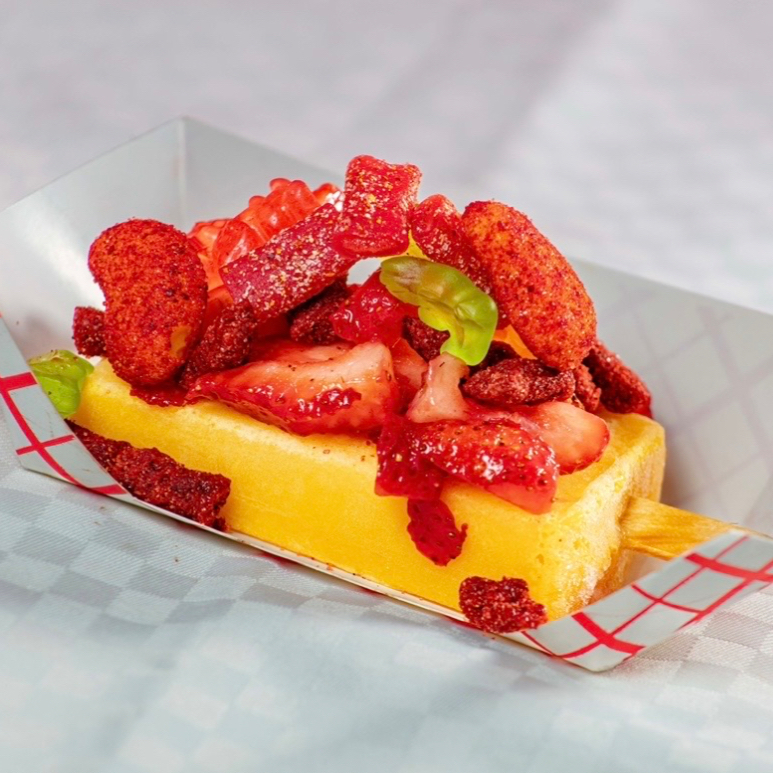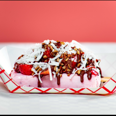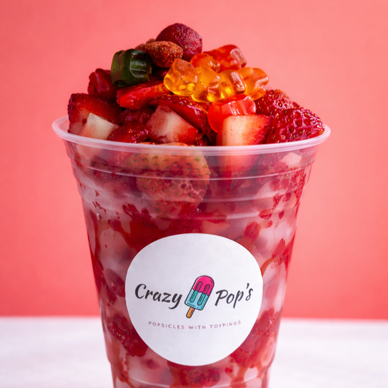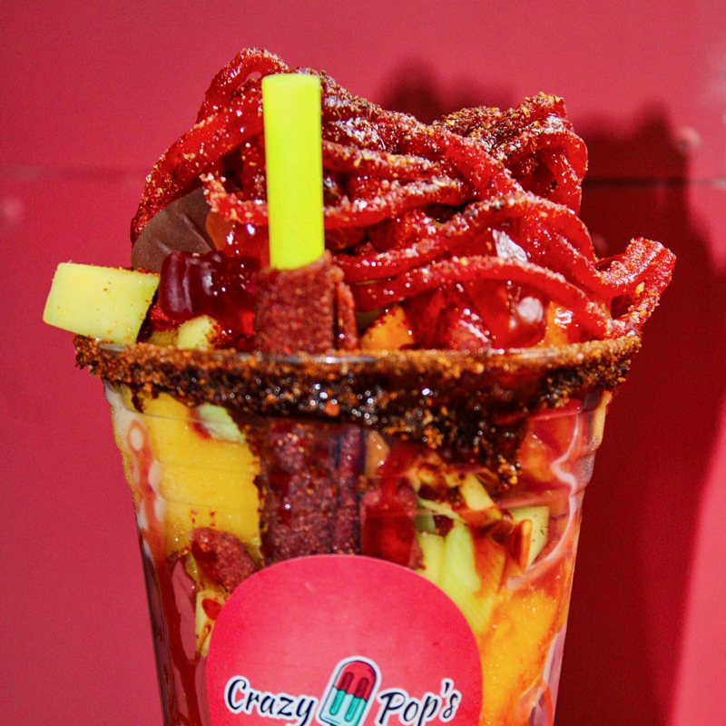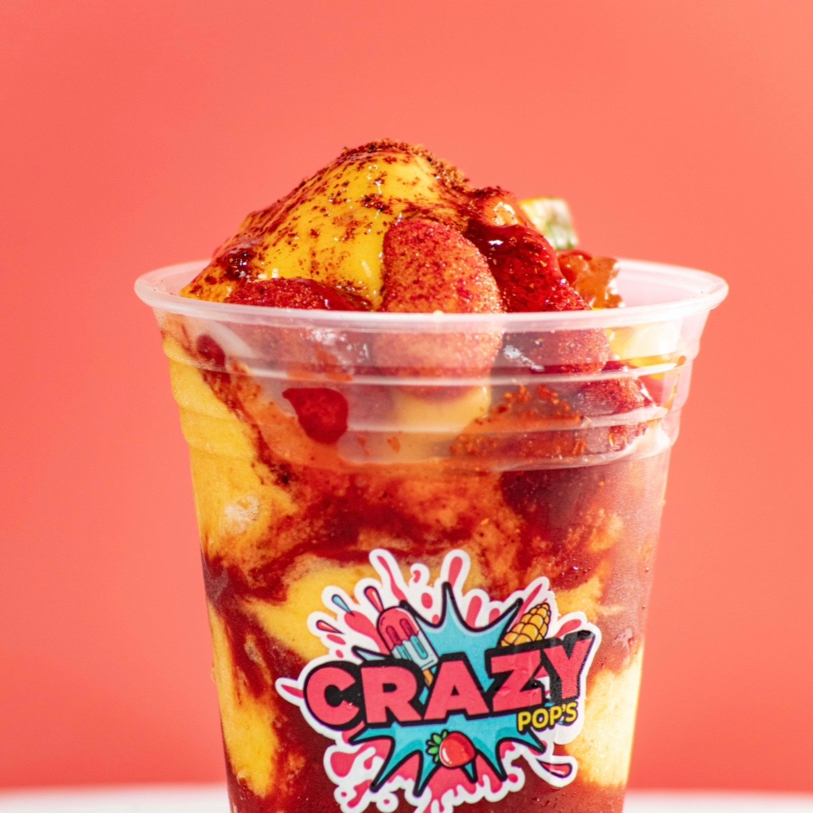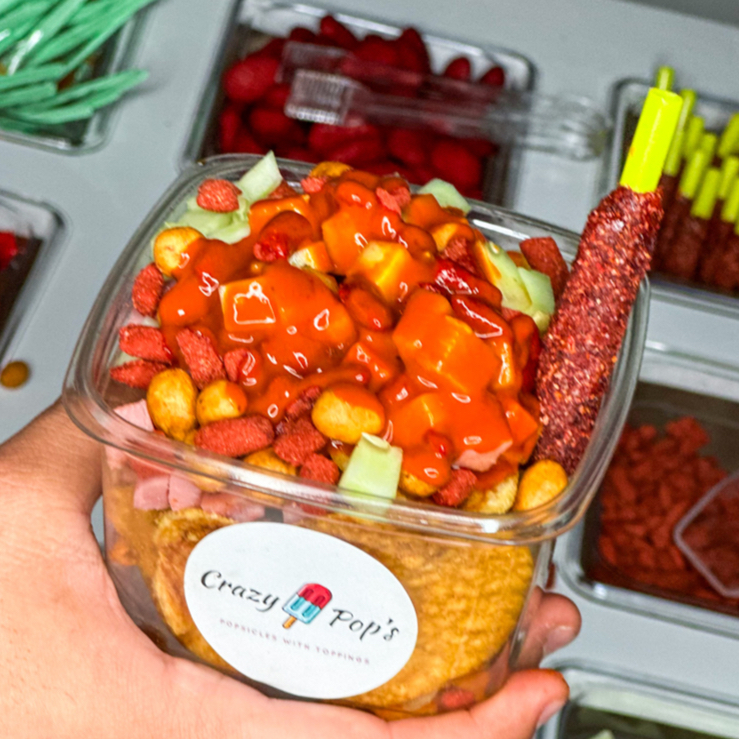PALETA DE HIELO DE AGUA CON FRUTA, 4 TOPPINGS A ELEGIR Y BAÑADA EN CHAMOY