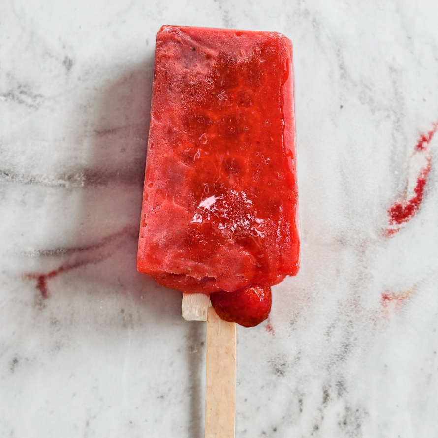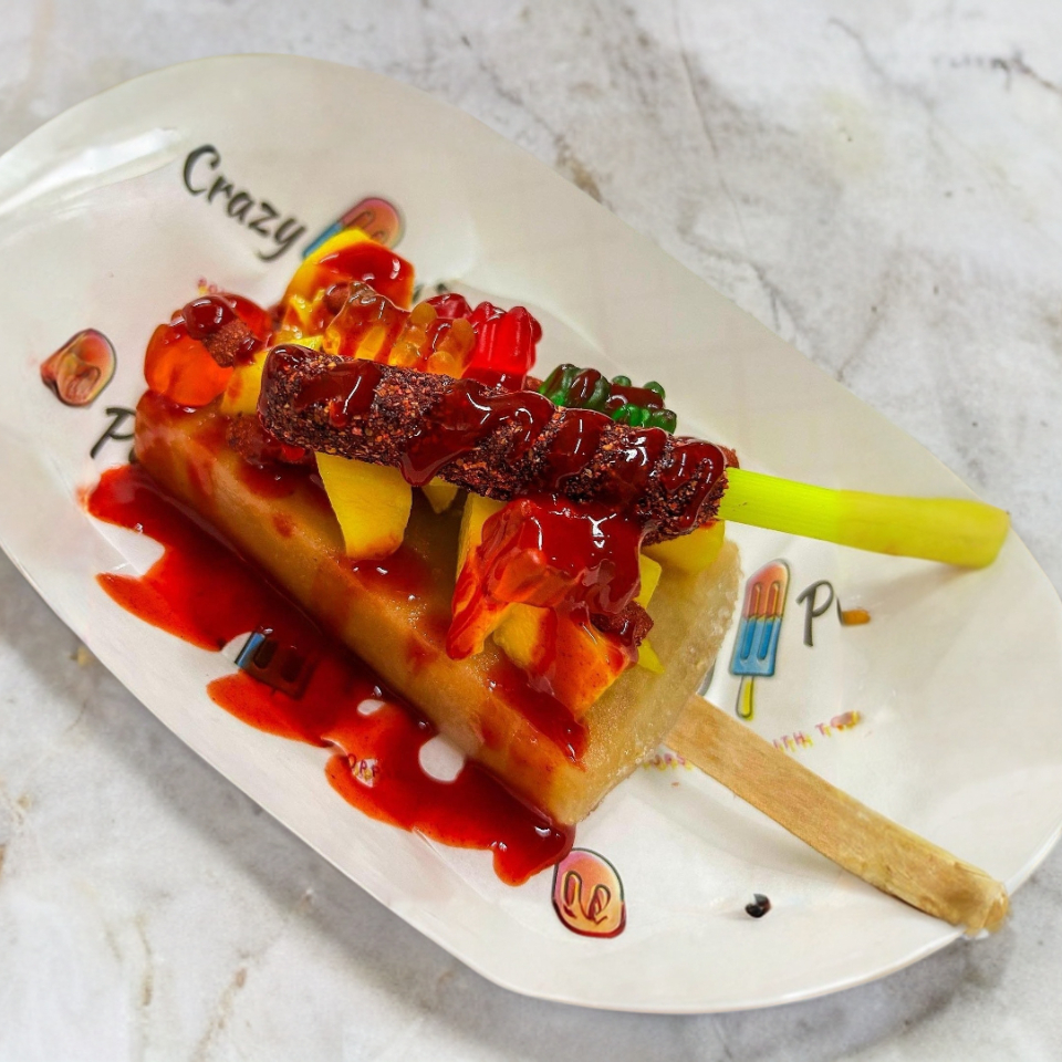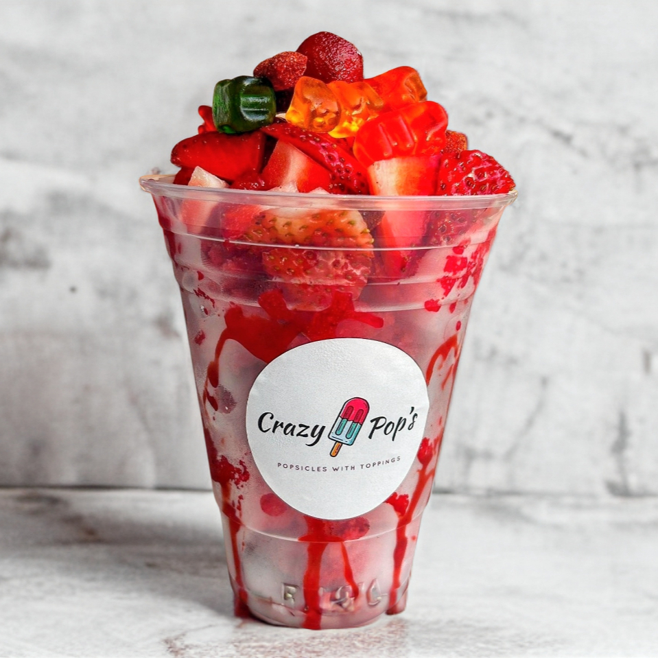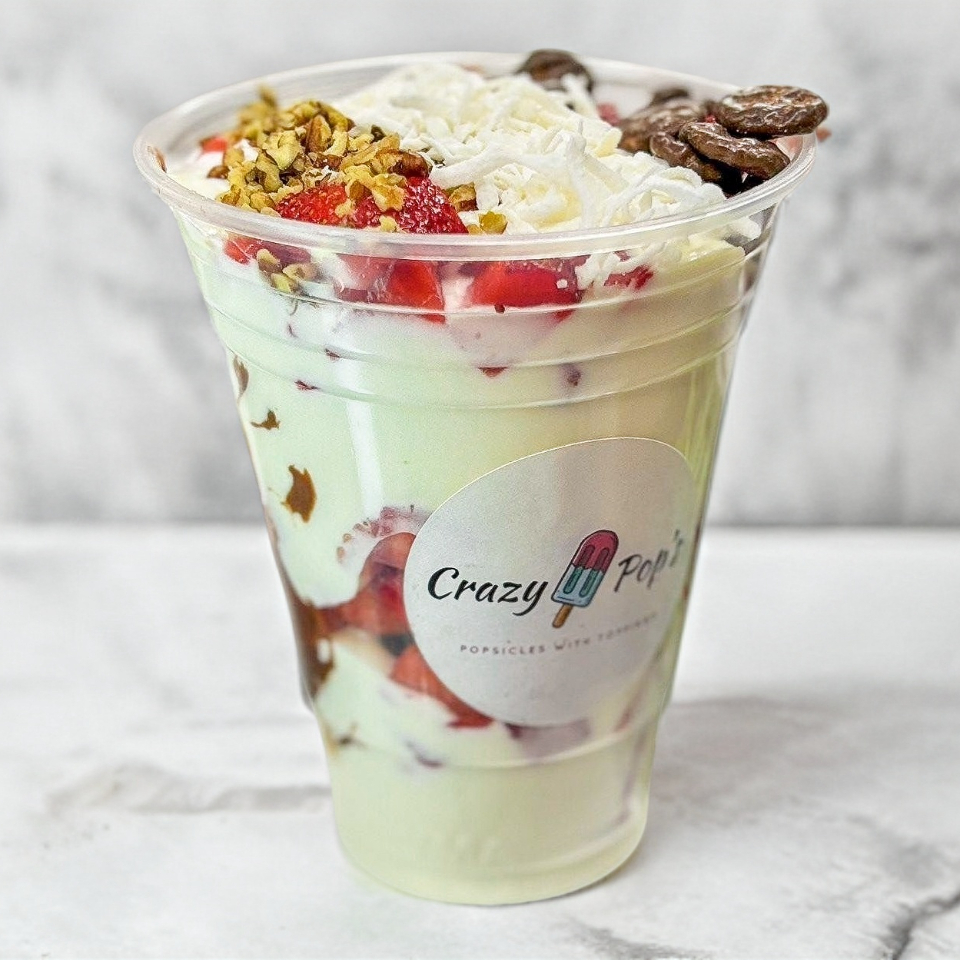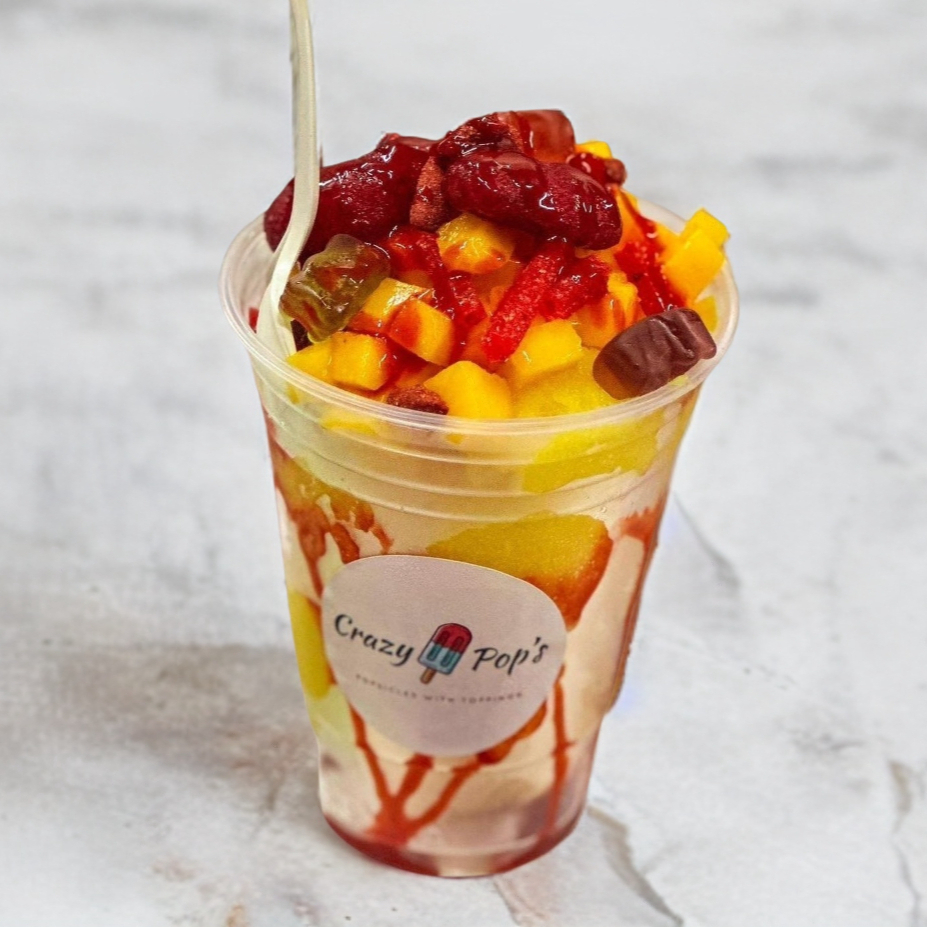 Paleta de hielo a base de agua con sabor de fruta a elegir, cubierta de toppings y fruta picada