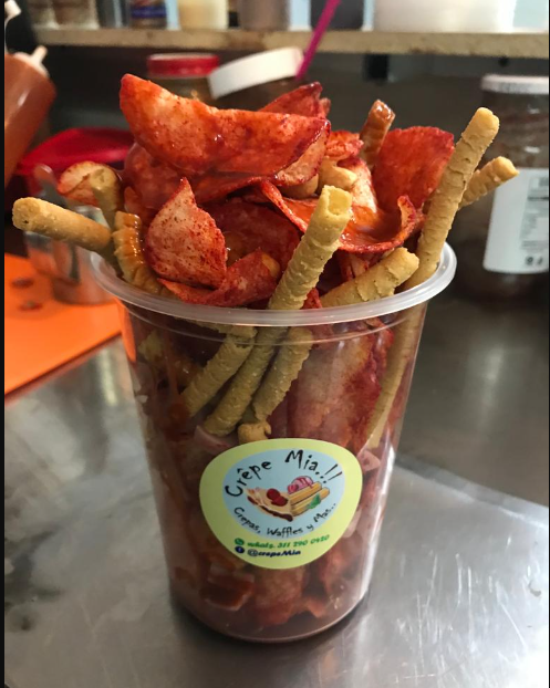Papa adobada o natural, churrito de maíz, salchicha, cacahuate japones.