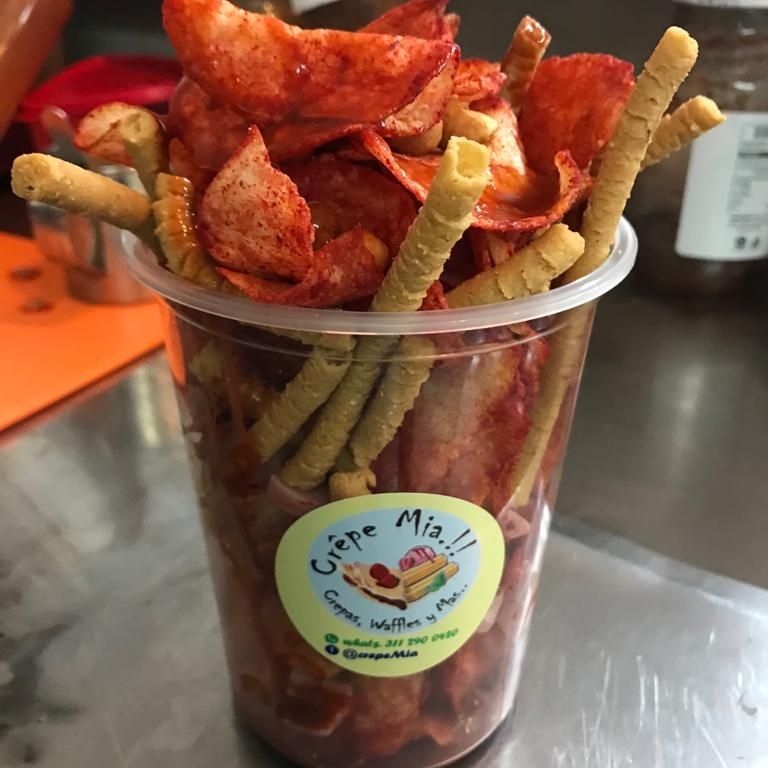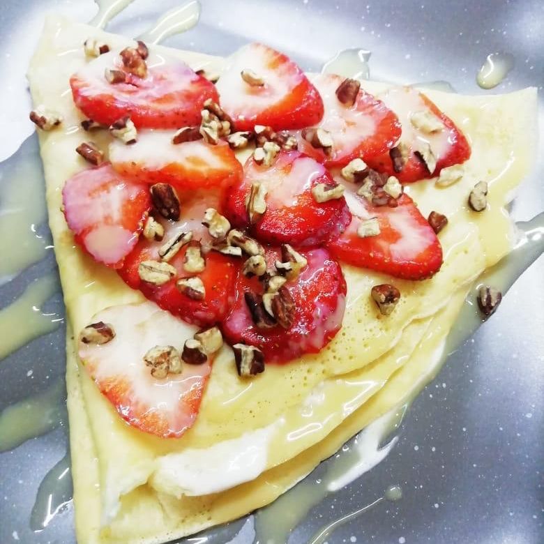 Base de cajera, fresa, manzana, durazno, Lechera, nuez (base disponible Nutella, Philadelphia, mermelada fresa, zarzamora y crema de cacahuate).