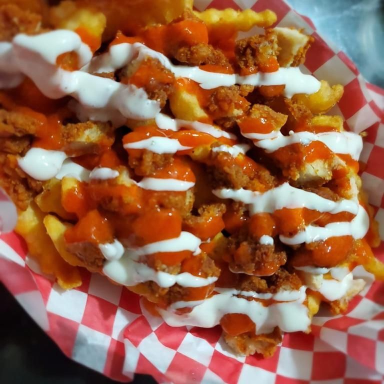 Papa clásica o adobada, cacahuates japones, salchicha, churritos de maíz, salsa preparada de la casa.