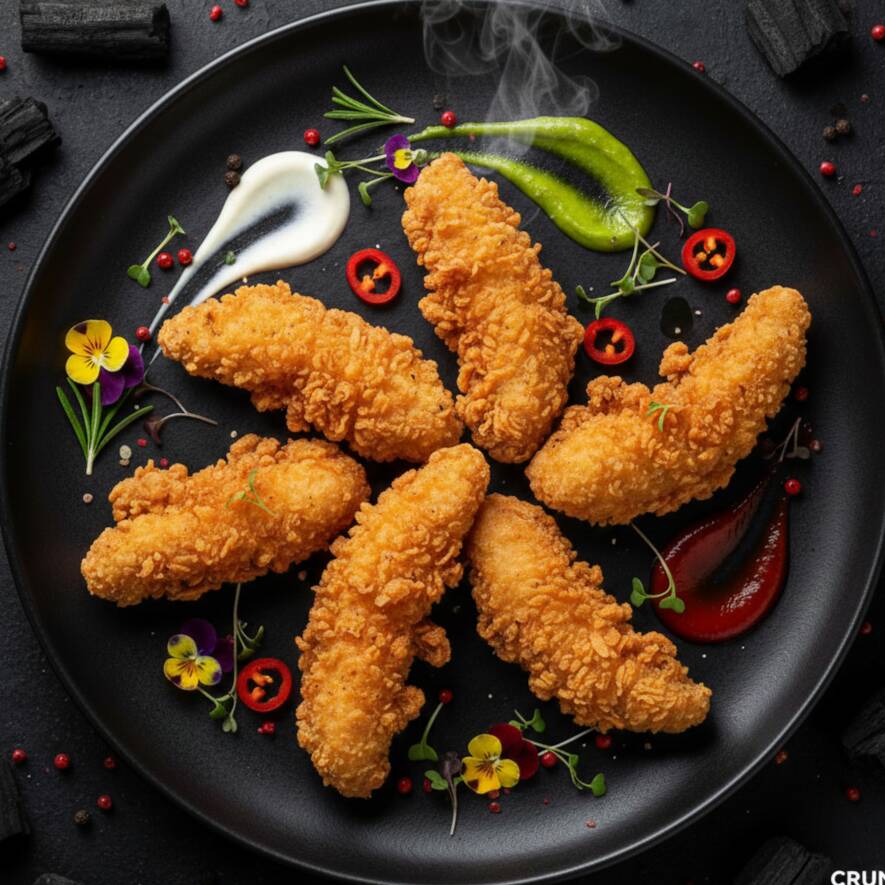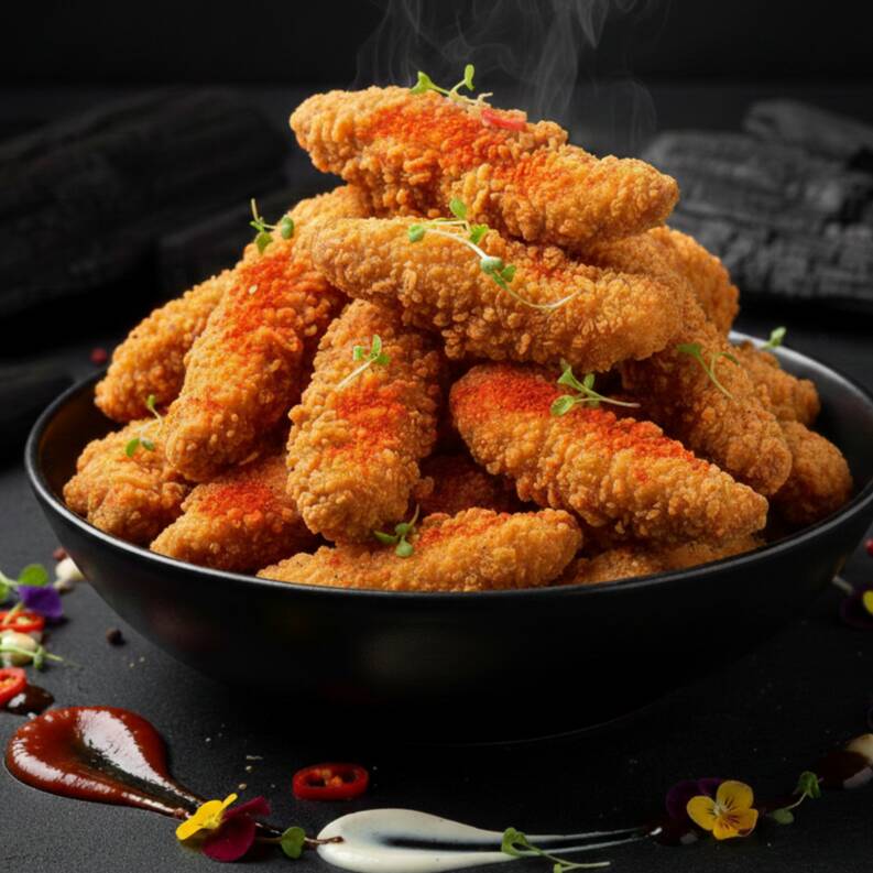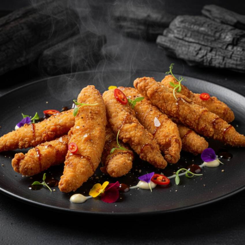 Deliciosos tenders maridados 24 horas en finas hierbas y especias, incluye 3 aderezos y 2 complementos