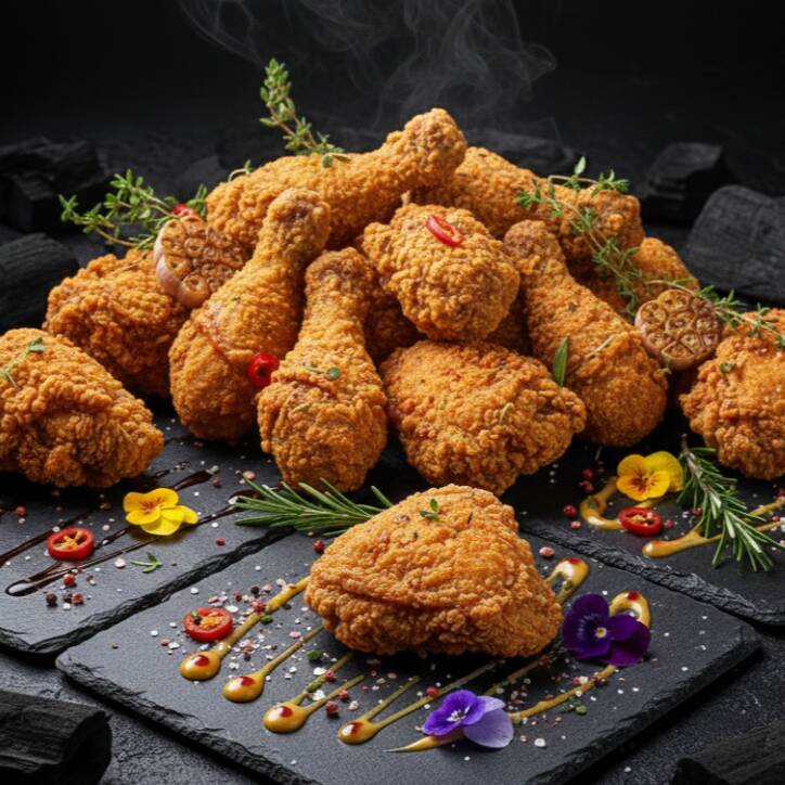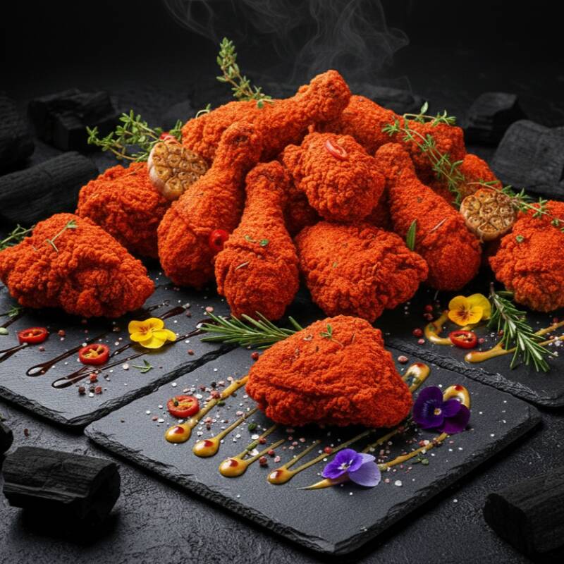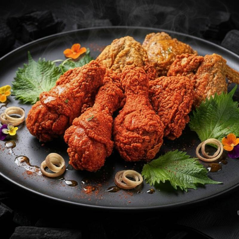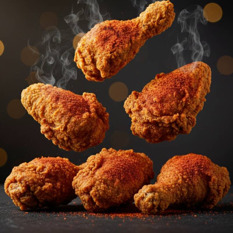 Pollo Nashville Picante y crujiente, marinado 24 horas en hierbas y especias, incluye 3 aderezos y 2 complementos