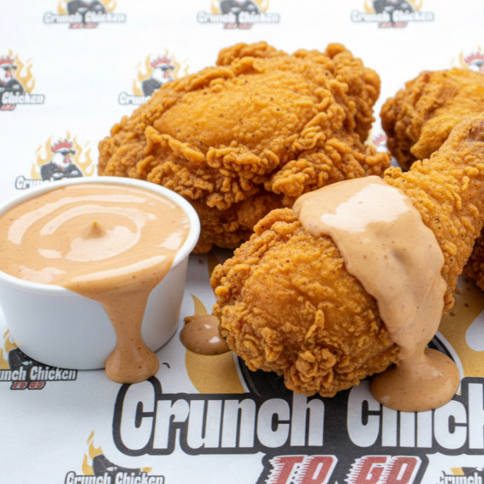 Pollo frito crujiente, maridado 24 horas, ¡empanizado crujiente y riquísimo! Incluye 3 aderezos y 2 complementos.