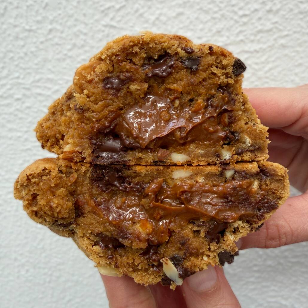 Galleta estilo New York de 145 gramos, rellena de dulce de leche, con almendra troceada, chispas de chocolate y un toque de café. Topping de almendra fileteada.