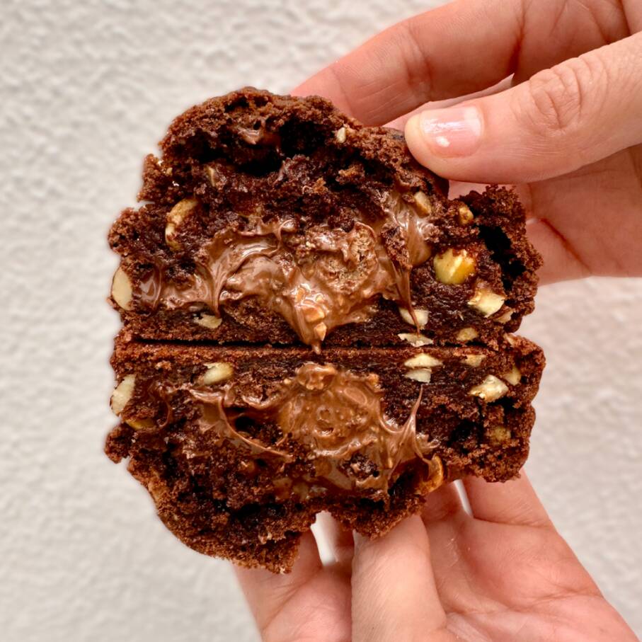 Galleta estilo New York de 145 gramos, rellena de nutella y avellana, con un Ferrero Rocher al centro.