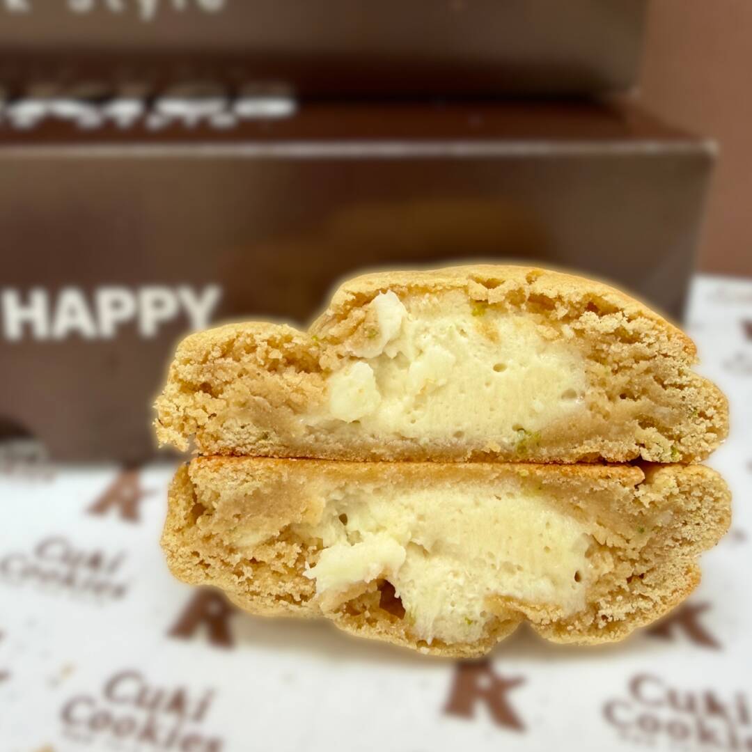 Galleta estilo New York de 145 gramos, raydura de limón, chocolate blanco rellena de frosting.