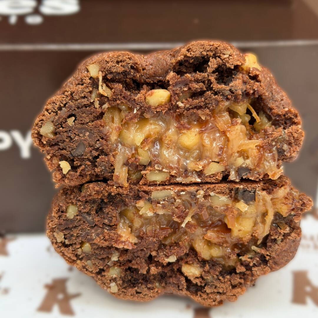 Galleta estilo New York de 145 gramos, nuez en trozo, rellena de coco alemán.