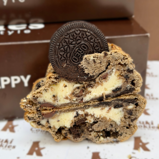 Galleta estilo New York de 145 gramos, con chocolate, chocolate blanco, oreo en trozos, rellena de frosting y topping de galleta Oreo.