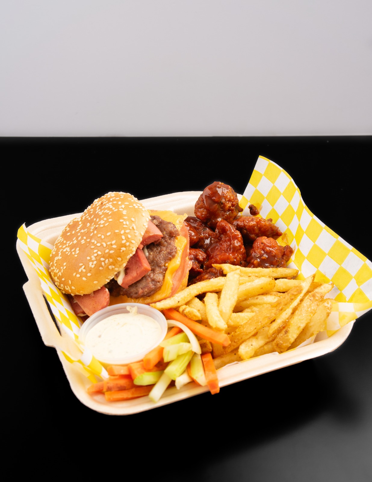 Una Hamburguesa (Carne, Jamón, Salchicha y Queso amarillo), 250 gr de Papas fritas, 250 gr de boneless con una salsa a elegir, Aderezo ranch, Zanahoria y Apio.