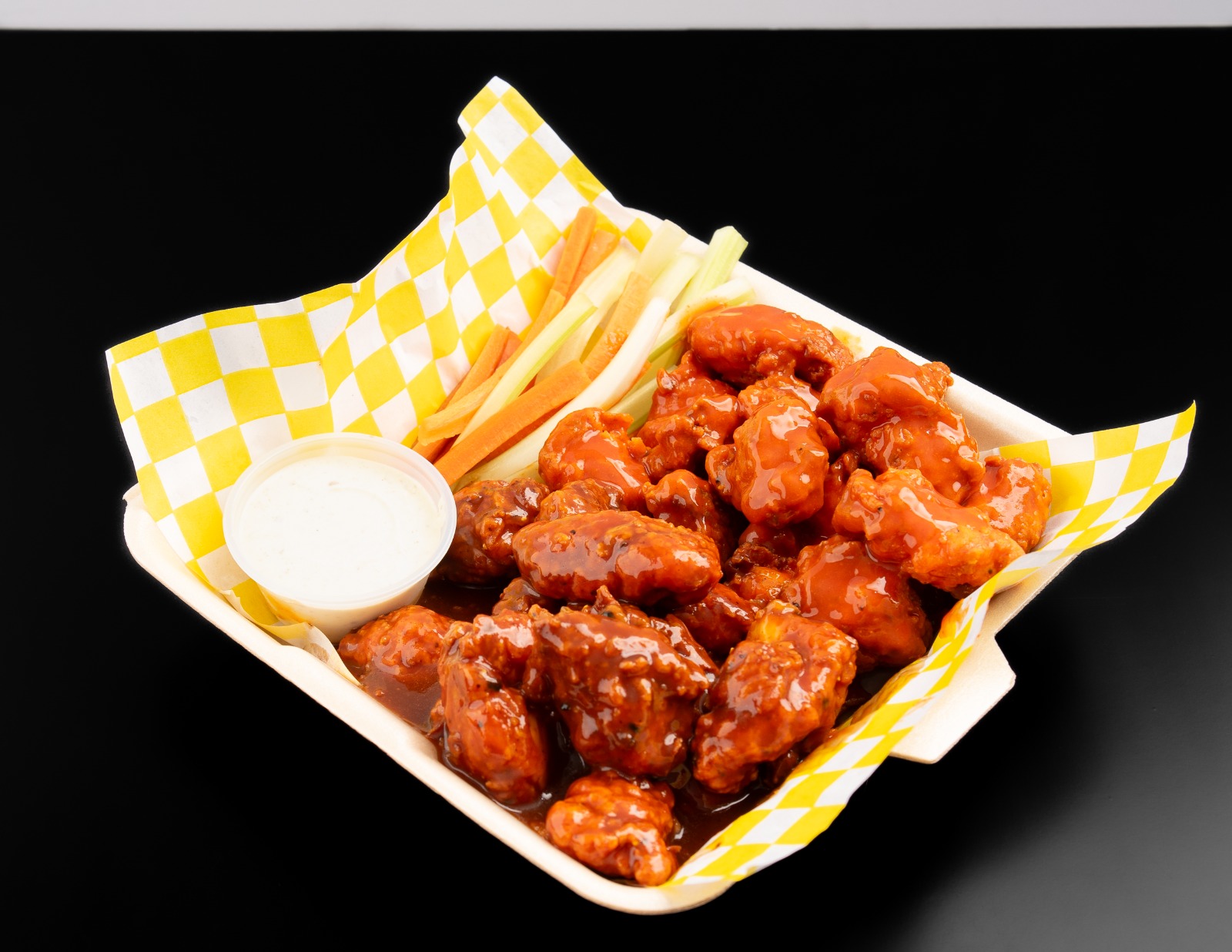 1 kg de Boneless con hasta cuatro salsas a elegir, 500 gr de Papas fritas, Aderezo ranch, Zanahoria y Apio.
