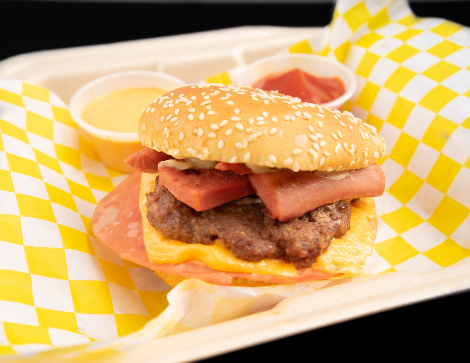 Deliciosa Hamburguesa con Carne, Jamón, Salchicha y Queso amarillo.