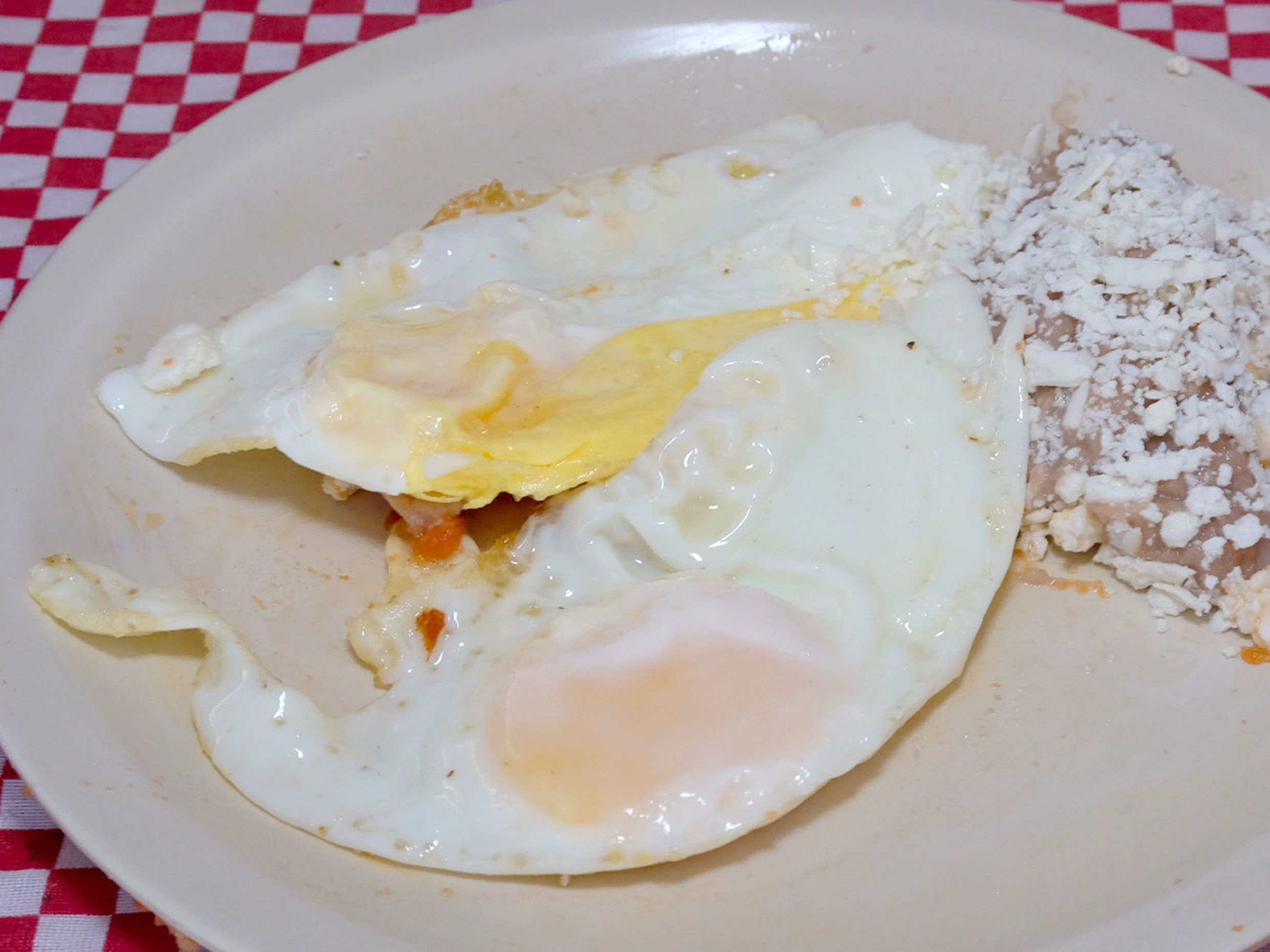 Dos piezas de huevo, preparadas a tu gusto, revueltos, estrellados acompañados de frijoles y tortilla