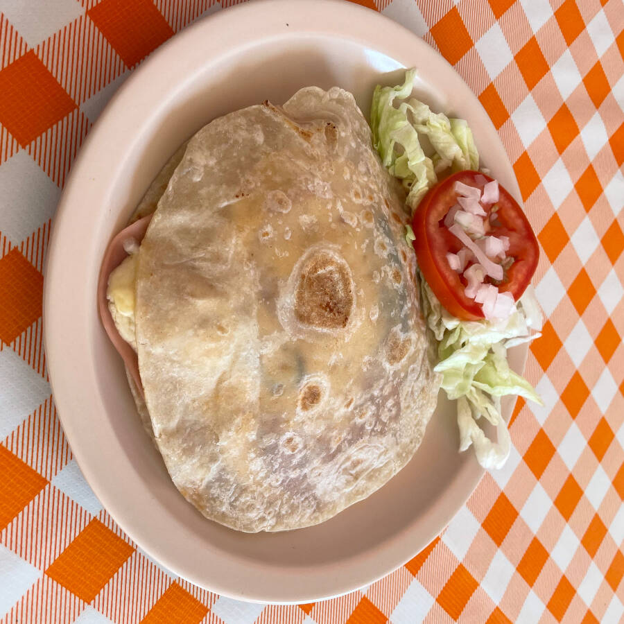 Tortilla de harina con jamón y queso amarillo