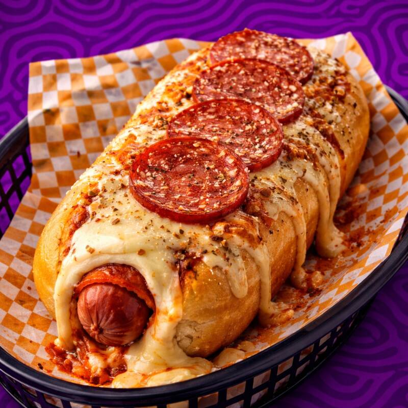 Una locura estilo pizza en versión dogo 🤤🔥 Salchicha envuelta en tocino dentro de pan jumbo, bañada en salsa pizzera especial, queso mozzarella derretido y coronada con pepperoni doradito y un toque de parmesano.