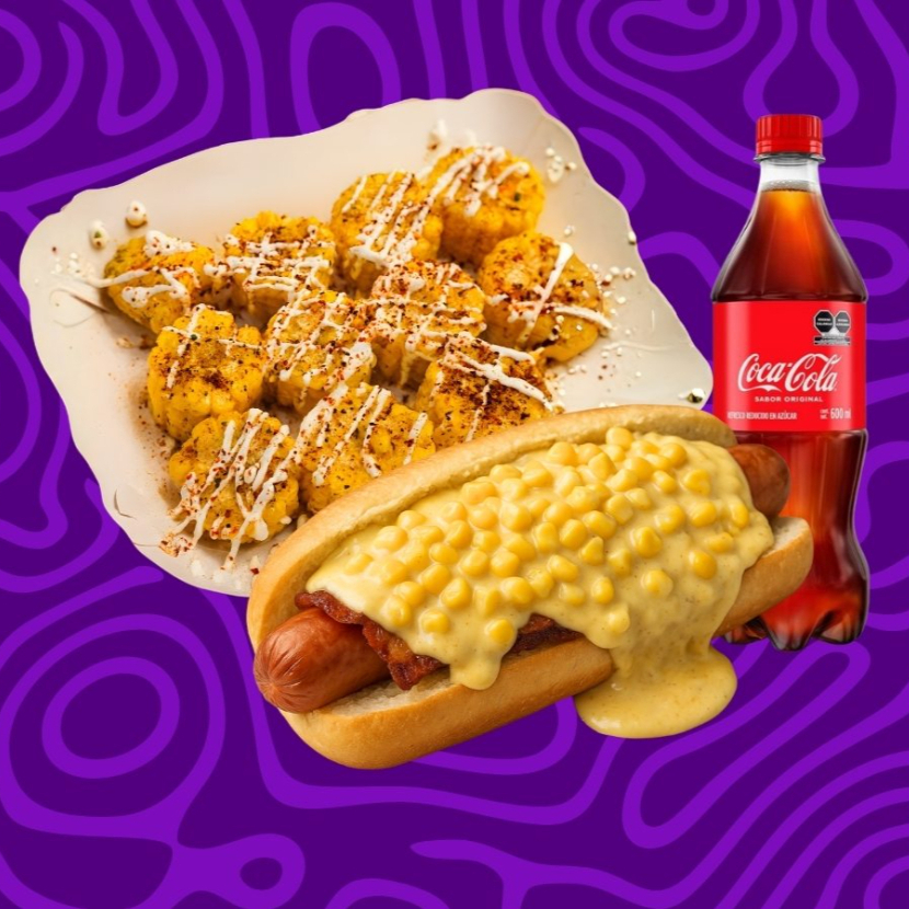 Pan jumbo artesanal, salchicha jumbo con tocino, bañado con una exquisita mezcla de 3 quesos y elotes dorados, acompañado con una porción de papas y una rodaja de elote frito
