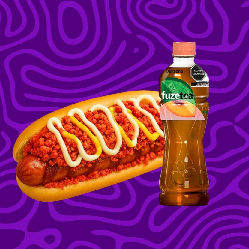 Pan jumbo artesanal, con salchicha cubierta con tocino, cebolla caramelizada y pimientos, con una cobertura de crujiente Cheetos Flaming Hot y queso de nachos, acompañado con papas y una rodaja de elotito amarillo