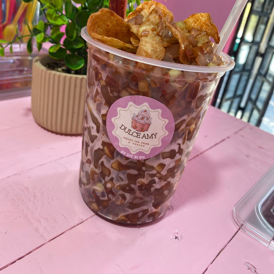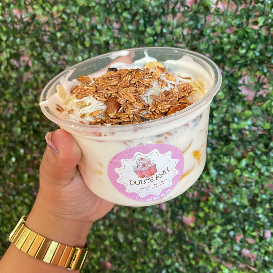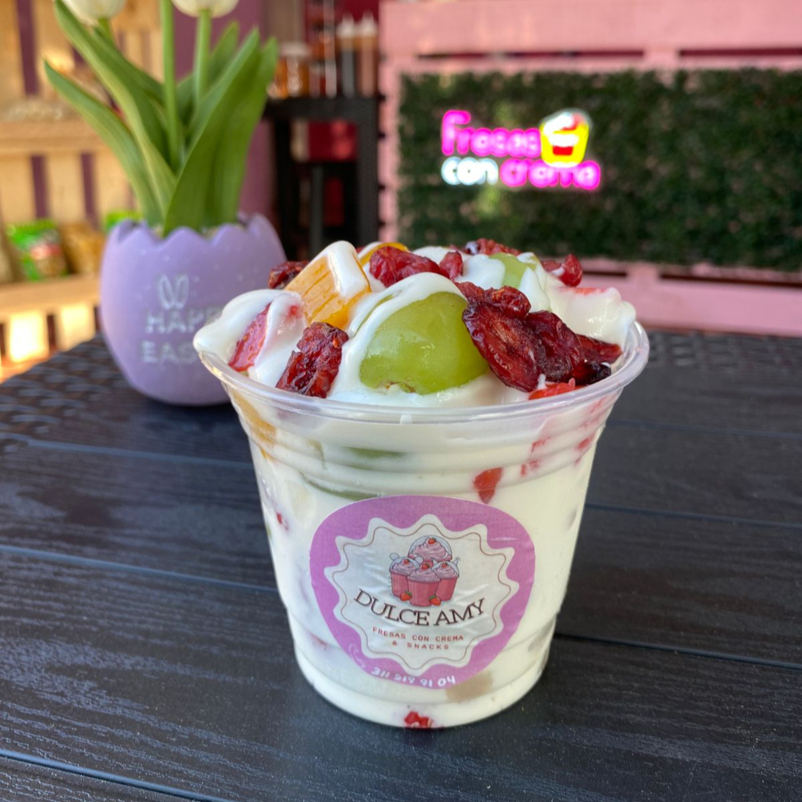 vaso12oz relleno de crema combinada con fresa,durazno,uva,platano y 2 topping a elegir
