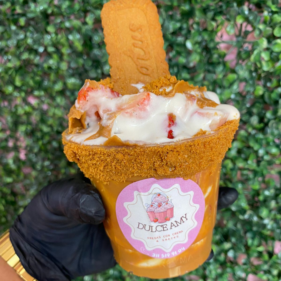 vaso 12oz relleno de crema lotus y crema de la casa fresa picada y 2 topping a elegir