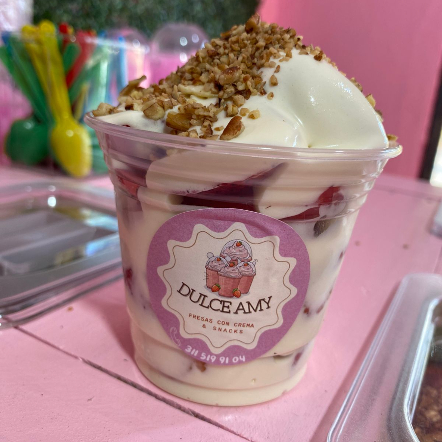 vaso 12oz relleno de crema de la casa fresa picada con 2 topping a elegir