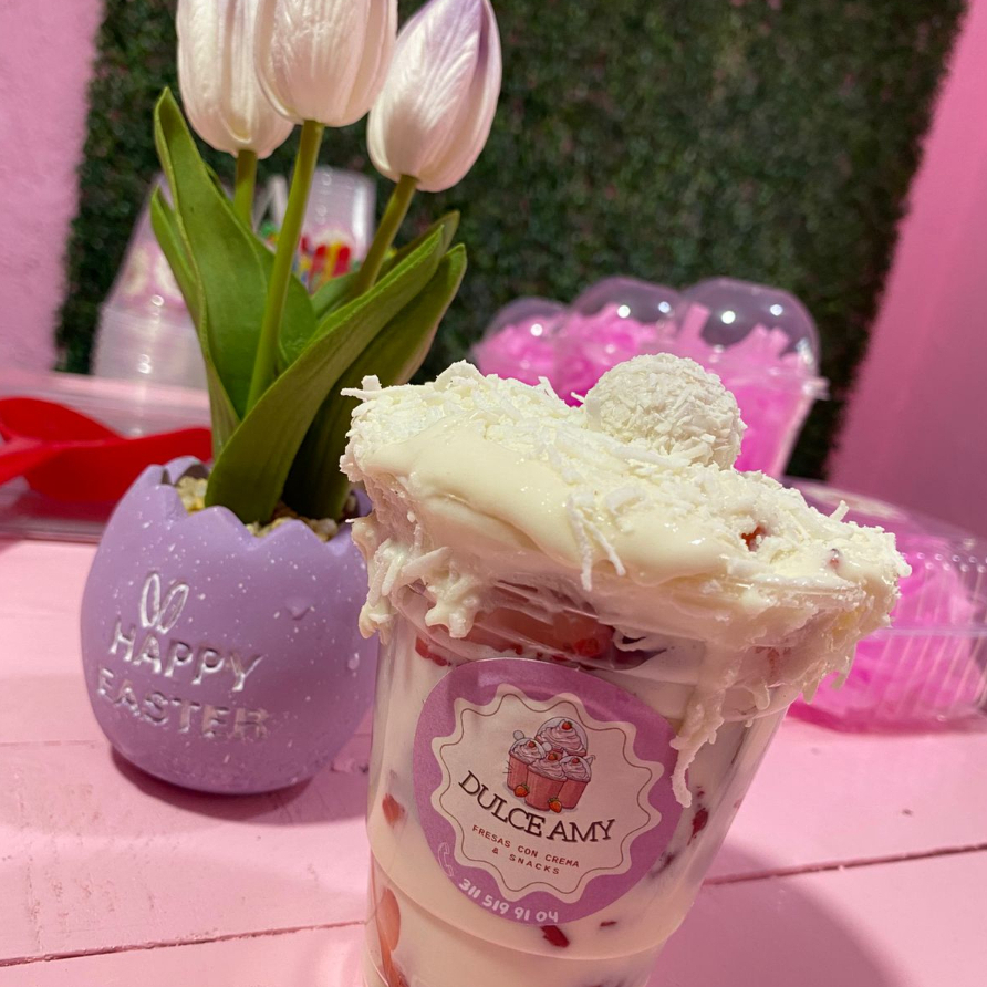 vaso 12oz relleno de crema raffaello de la casa, fresa picada y 2 topping a elegir