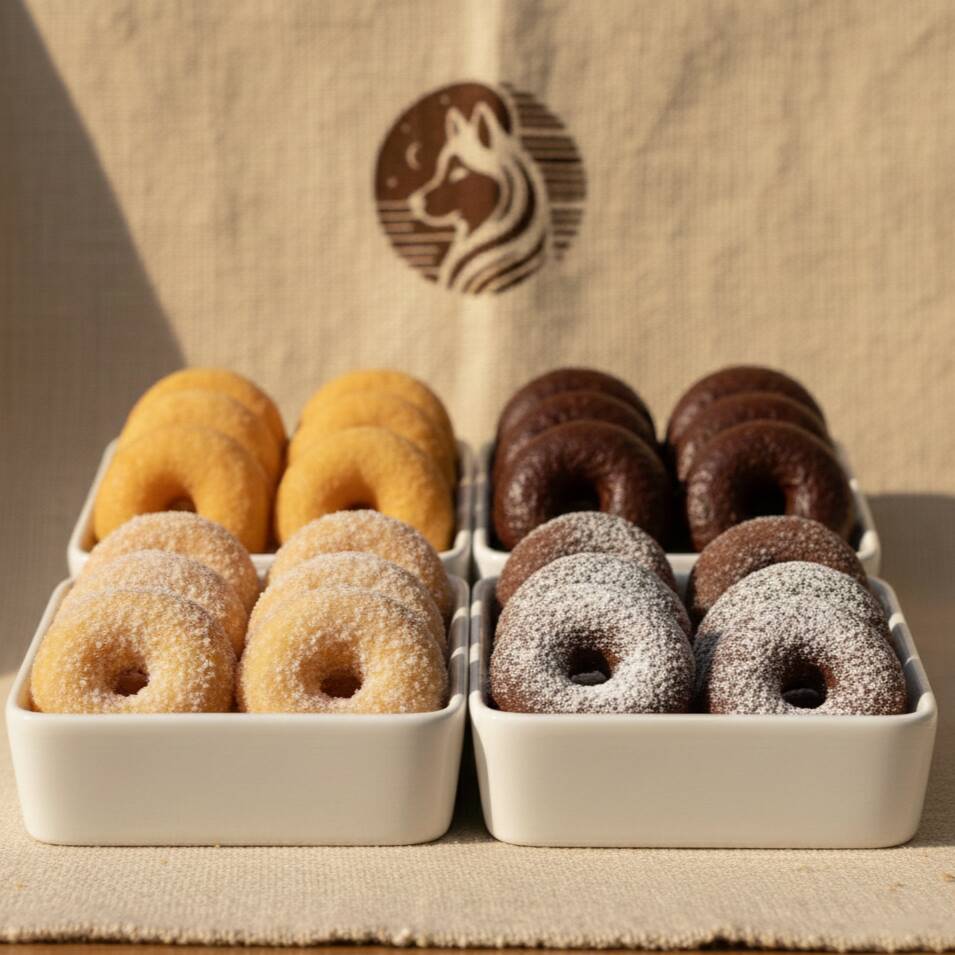 Mini donas hechas sin aceite con nuestra receta casera, vainilla / chocolate / vainilla azucarada / chocolate espolvoreado. Acompañadas de un topping a tu elección.