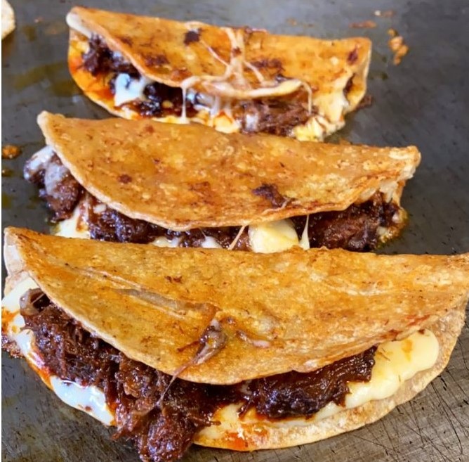 Rica quesadilla de tortilla de harina con queso de calidad y birria de res.