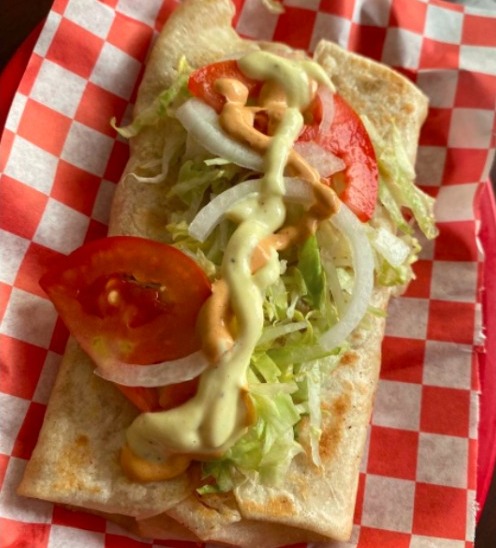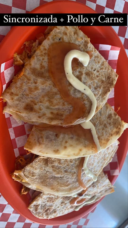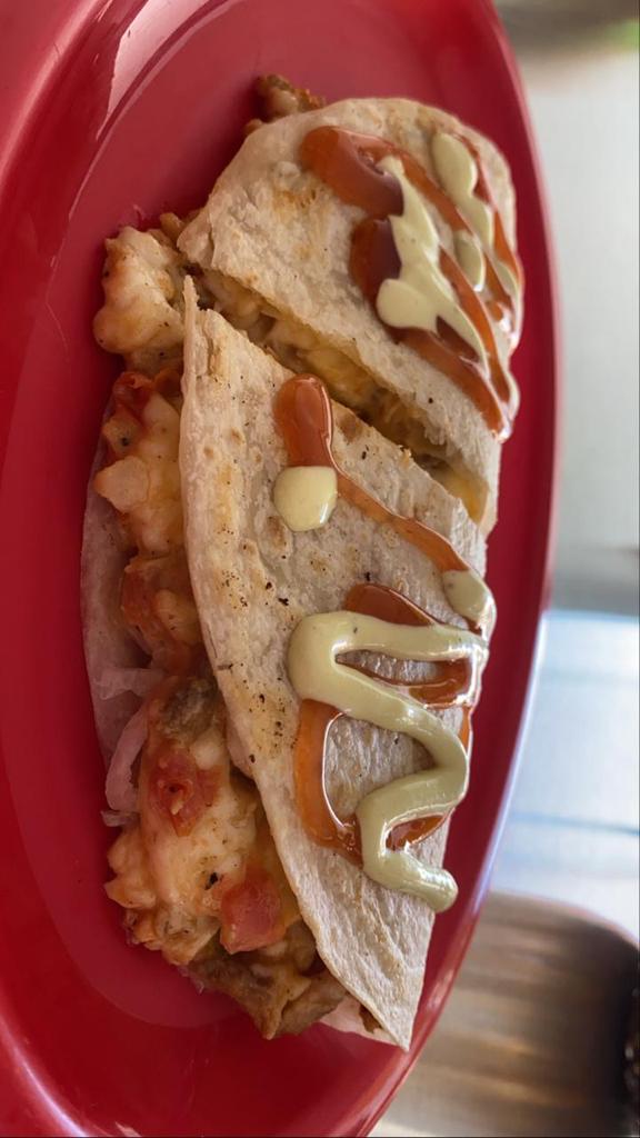 Tortilla de harina con jamón, queso amarillo, queso asadero y verdura.