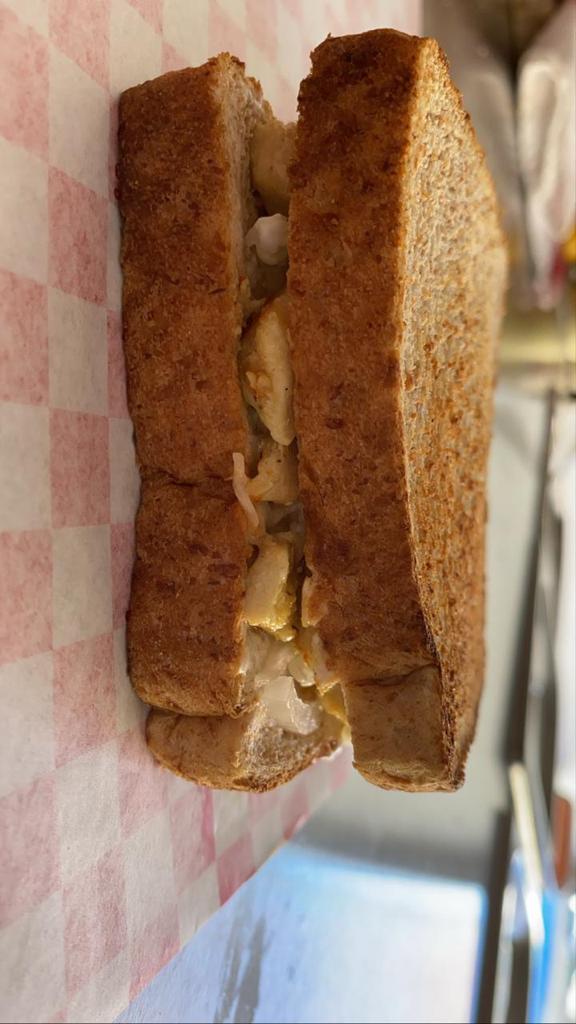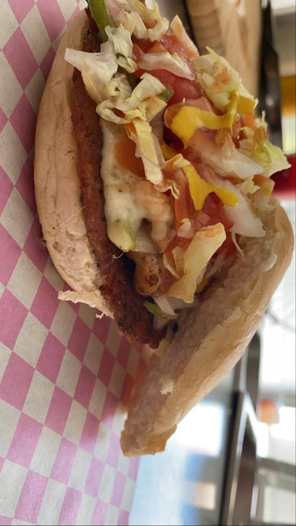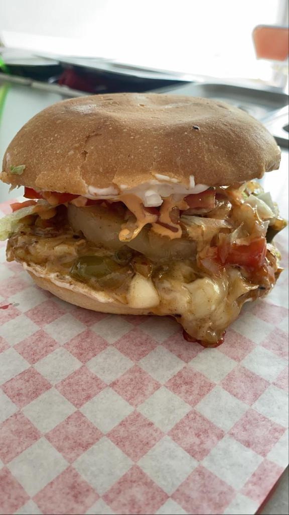 Carne de Pollo, lechuga, cebolla y jitomate con catsup y mostaza, mayonesa.