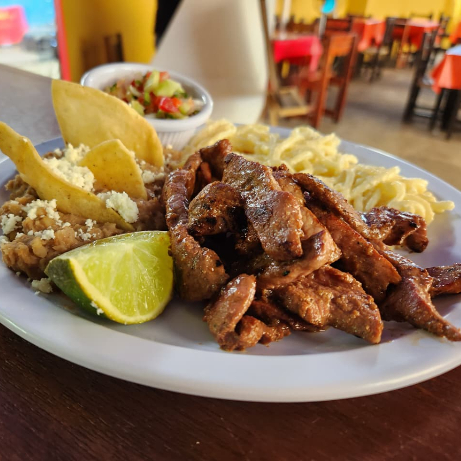 Elige entre nuestra jugosa Arrachera, Carne Asada o Fajitas de Res. Acompañado de dos guarniciones variables del día que complementan el sabor de la parrilla. Incluye tortillas y agua fresca de temporada.