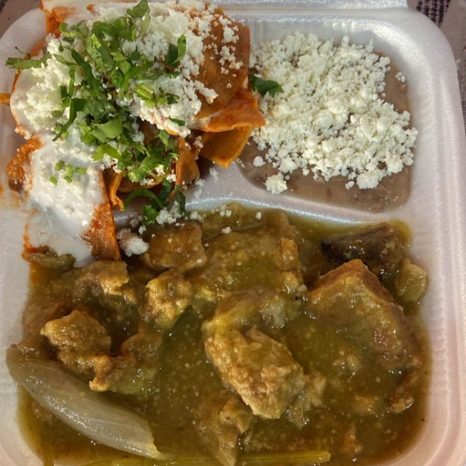 El favorito de la casa: porción de guisado del día, chilaquiles clásicos, frijoles refritos y un vaso de agua fresca natural. La combinación perfecta para quedar satisfecho.