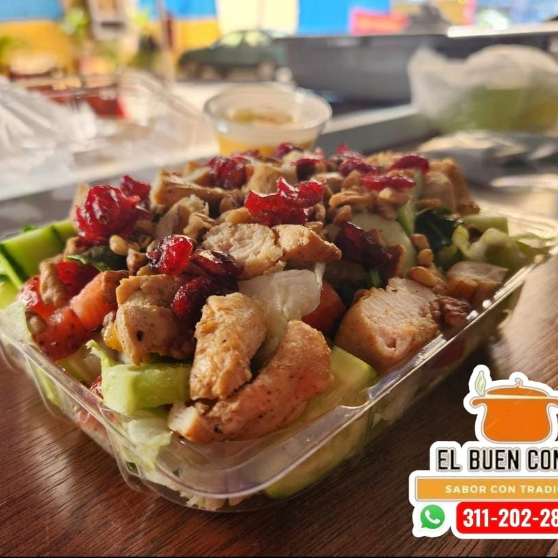 Base de lechuga, espincas, pepino, fresa, arandanos, crotones, nuez y aderezo. Proteina opcional