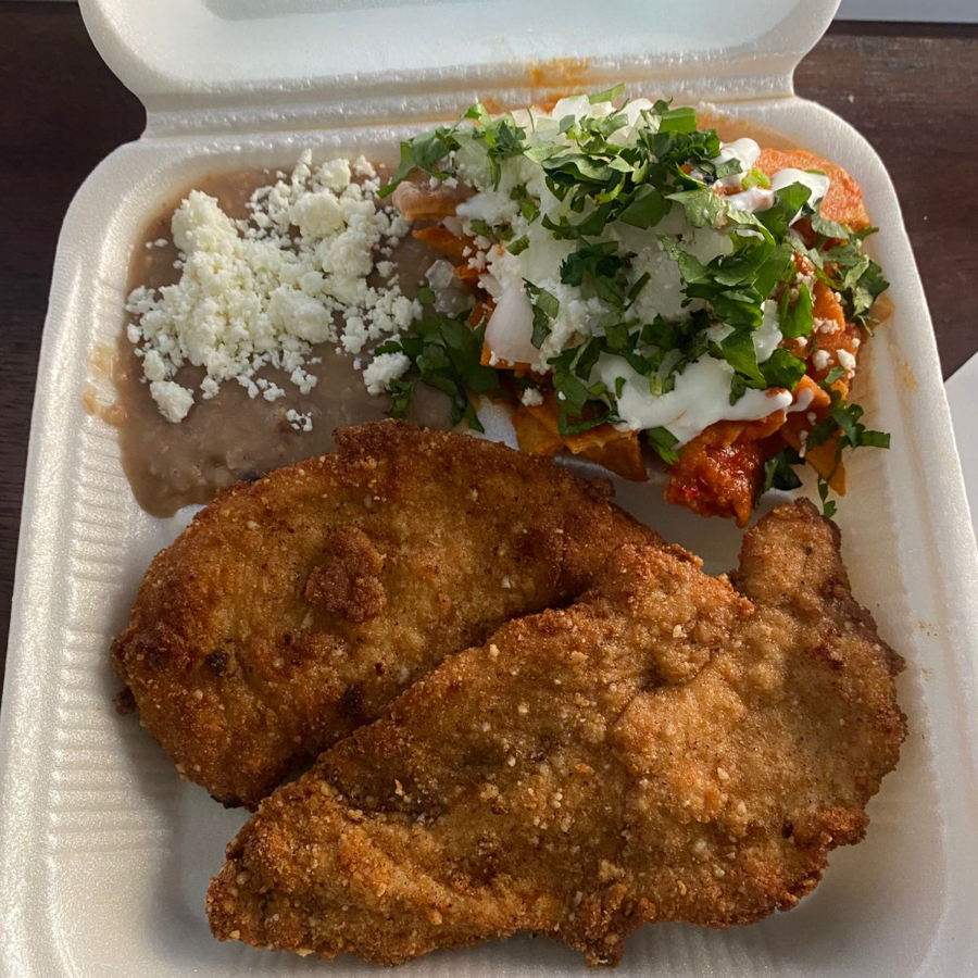 Disfruta de un jugoso pollo a la plancha o el toque "crunchy" de nuestra milanesa y palomitas. Servido con chilaquiles de la casa, frijoles y agua fresca del día. Una opción rendidora y deliciosa.