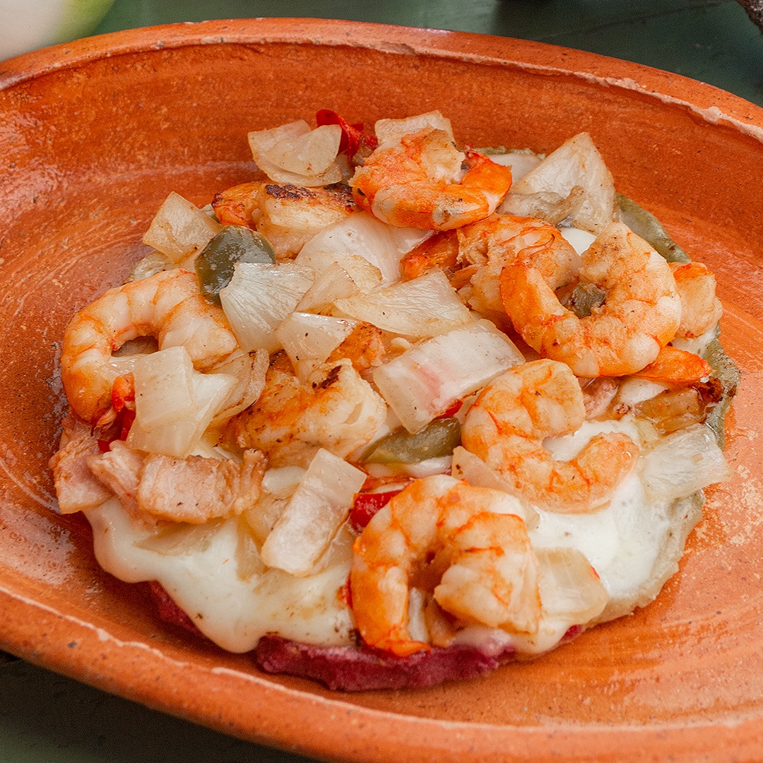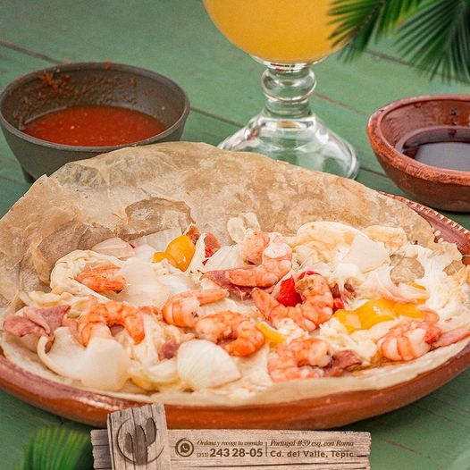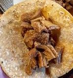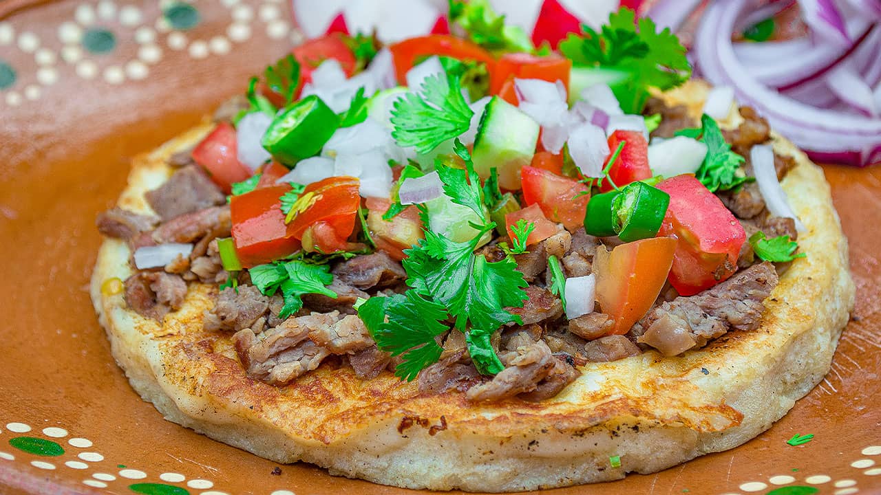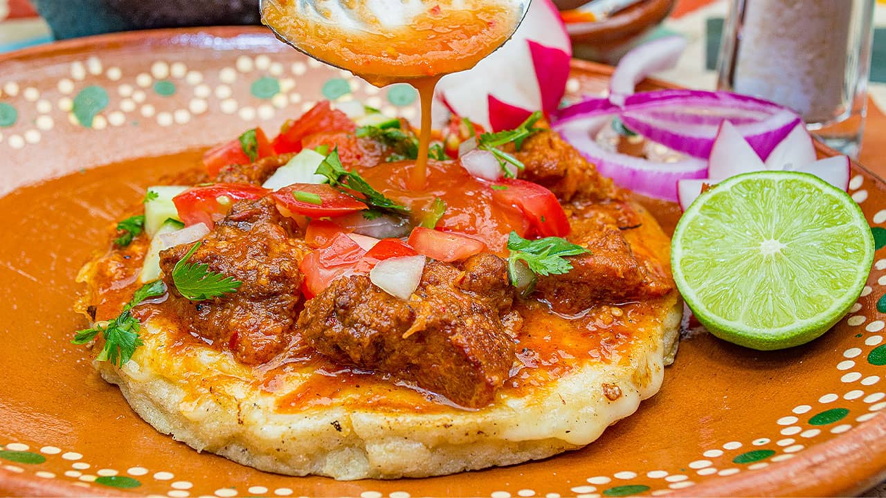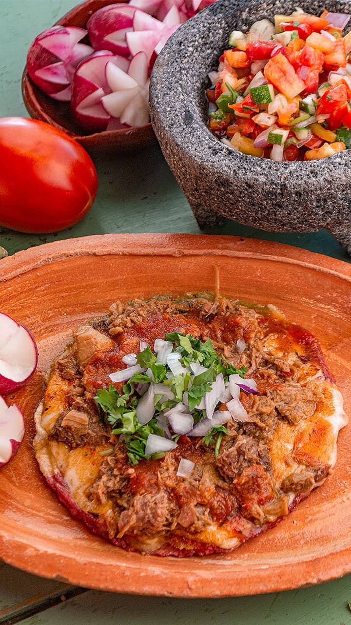 Tortilla gigante hecha a mano con chicharrón en salsa roja.