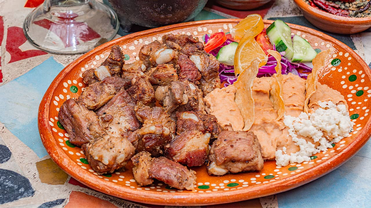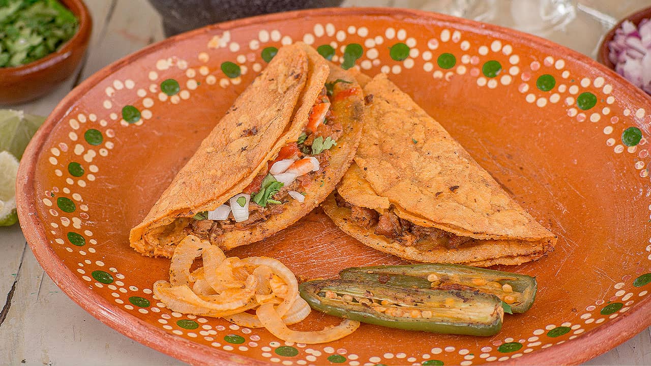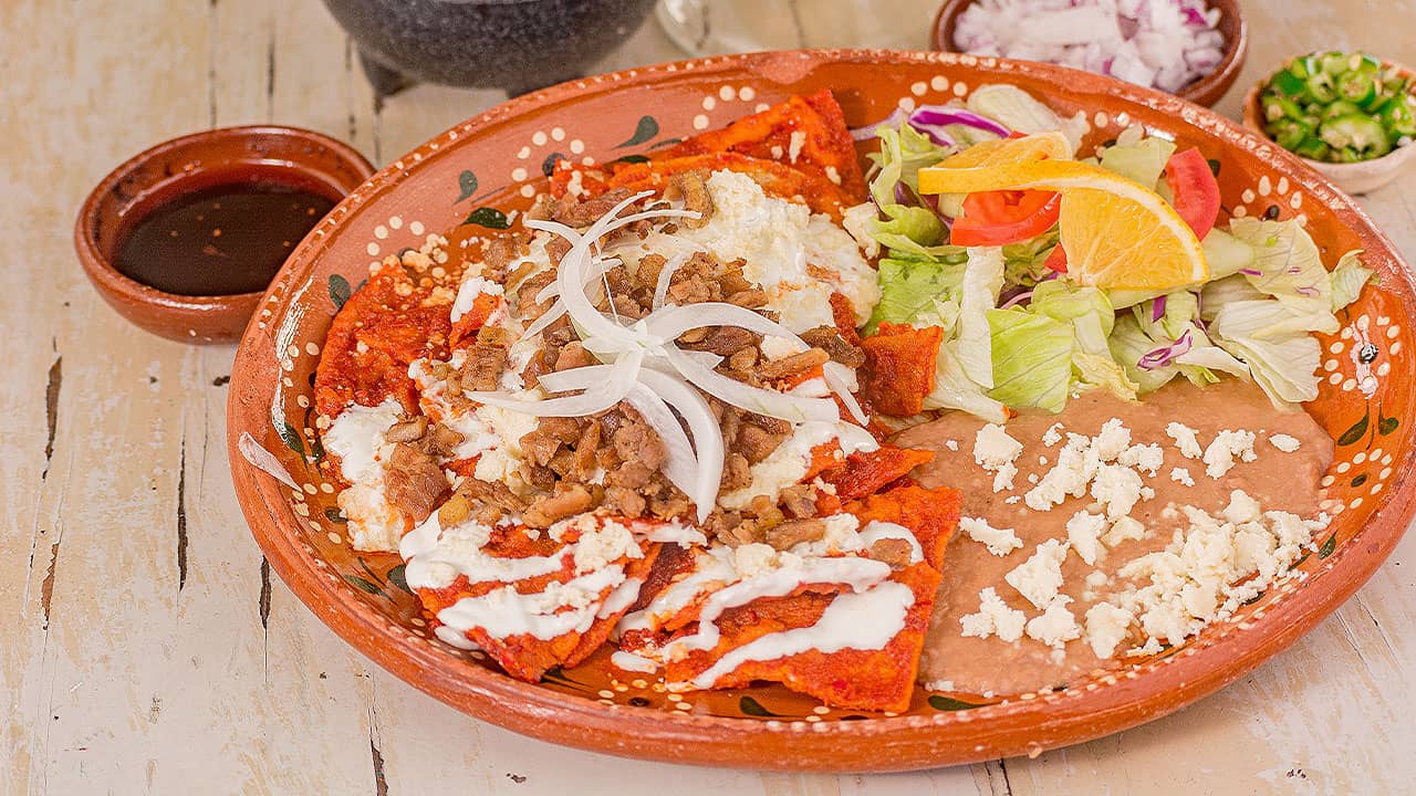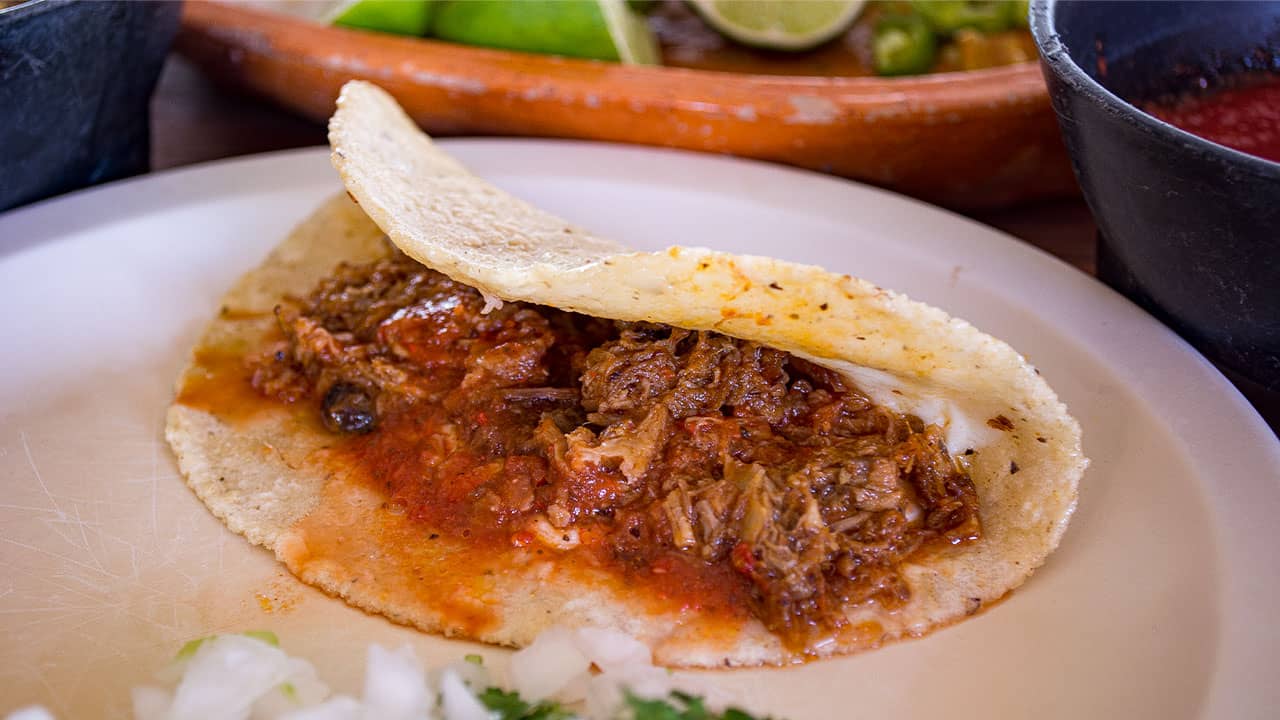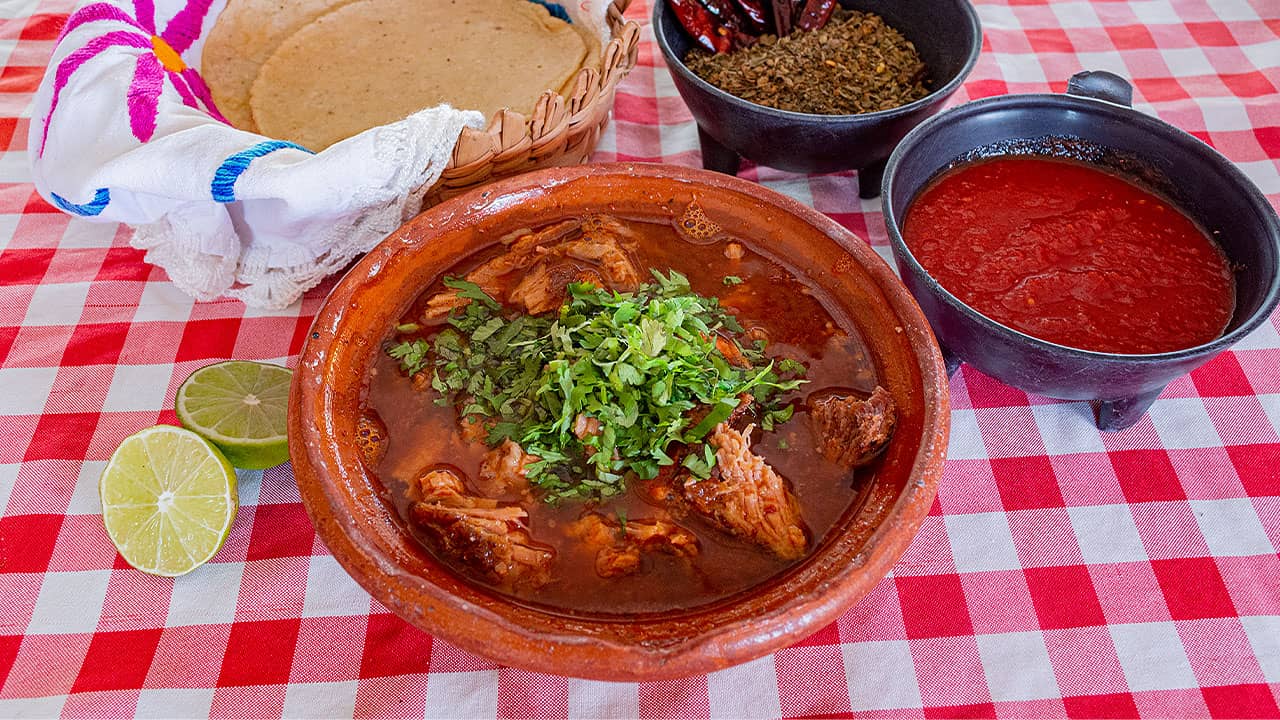 Tortilla gigante hecha a mano con chicharrón en salsa roja.