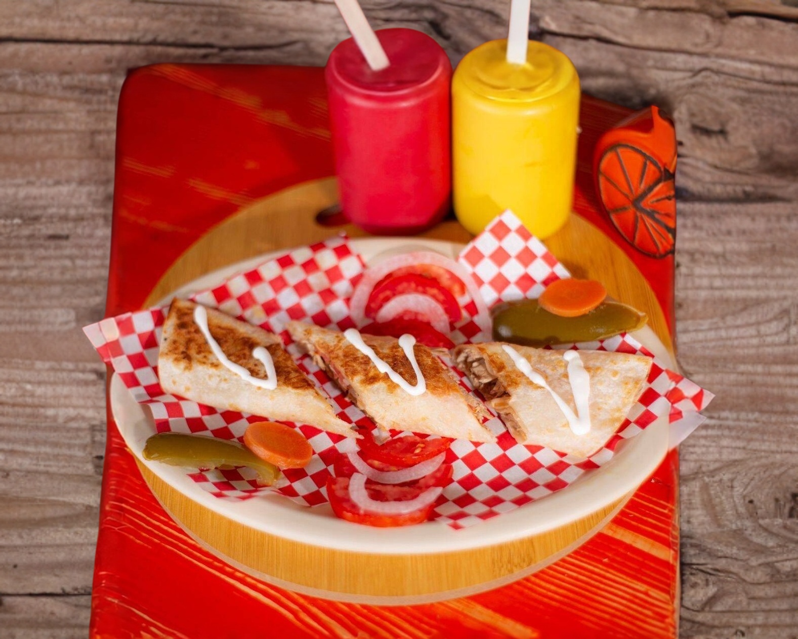 Quesadilla hecha con tortilla de harina, queso asadero y pierna