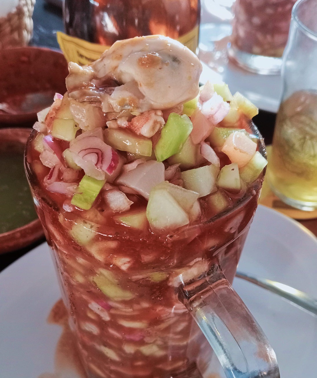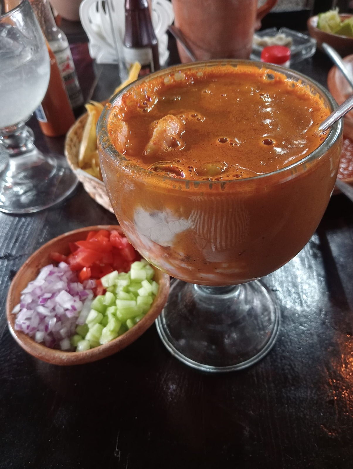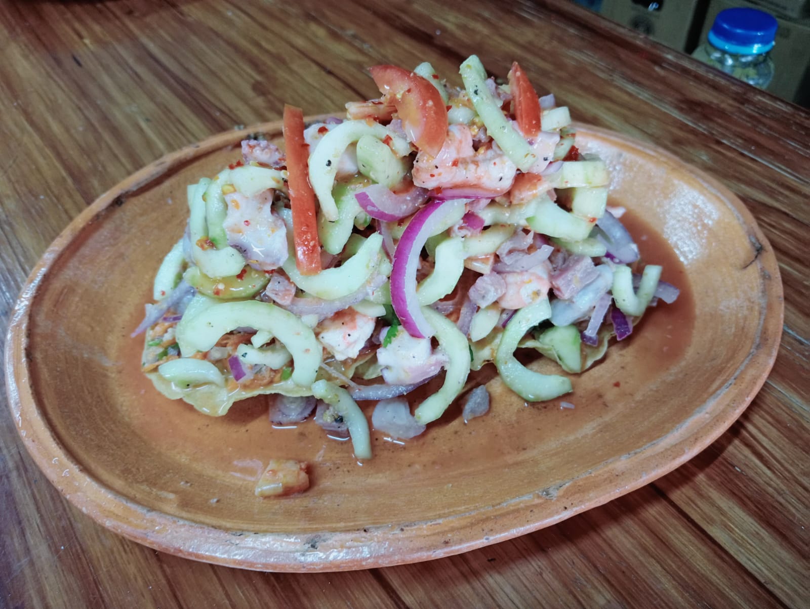 Medallón de atún, camarón cocido, crudo, seco y pulpo sobre una base de ceviche de pescado sazonado con clamato y salsa roja con piquín de la casa.