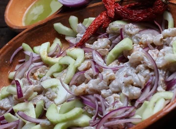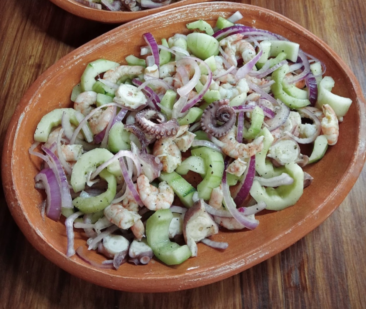 Camarón crudo, cocido, seco, pescado a cuadro y ostión con salsa de la casa.