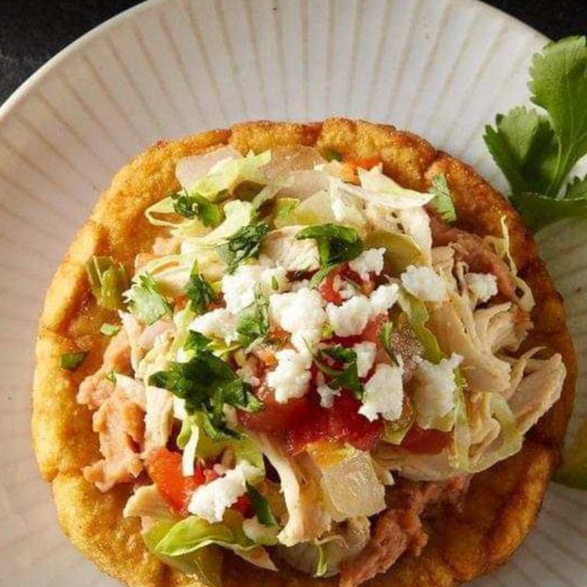 4 pzas. Sope de masa dorada en salsa, de pollo o pierna, verdura fresca, queso fresco, y crema. Incluye salsa de la casa