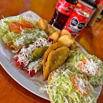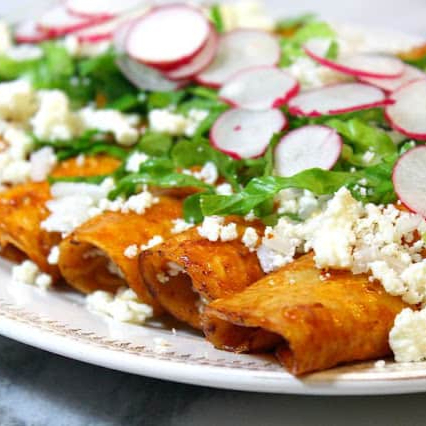 4 pzas de tortilla raspada enrollada, rellena de pollo o pierna o res co papa. Por fuera verdura fresca, queso fresco, crema. Incluye salsas de la casa.