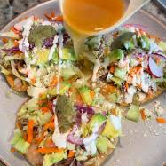 Una tostada raspada con base de frijol, encima pollo o pierna, verdura fresca, queso fresco. Incluye salsa de la casa.