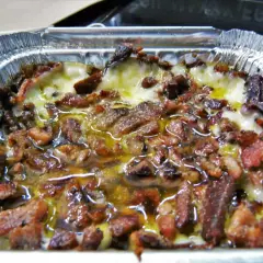 Papas gratinadas con queso navarro, carne asada, cebollita, chile toreado y salsas.